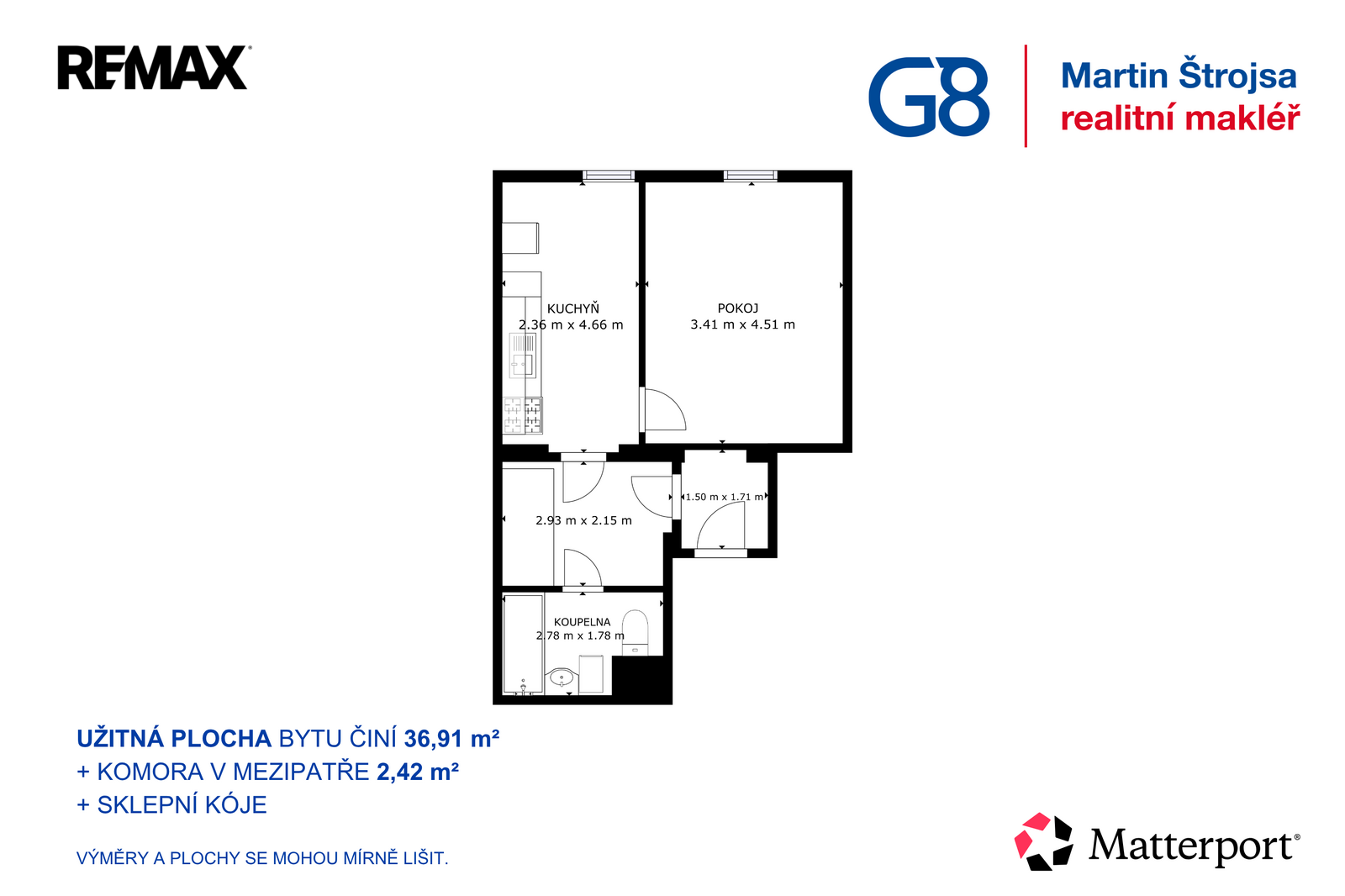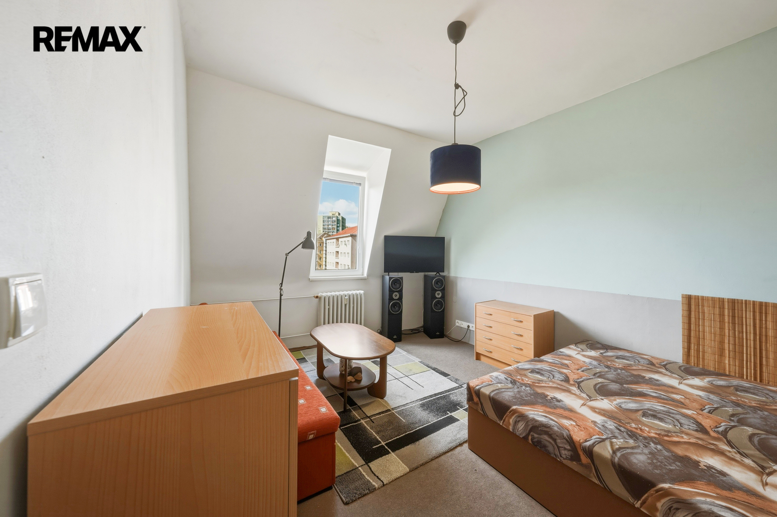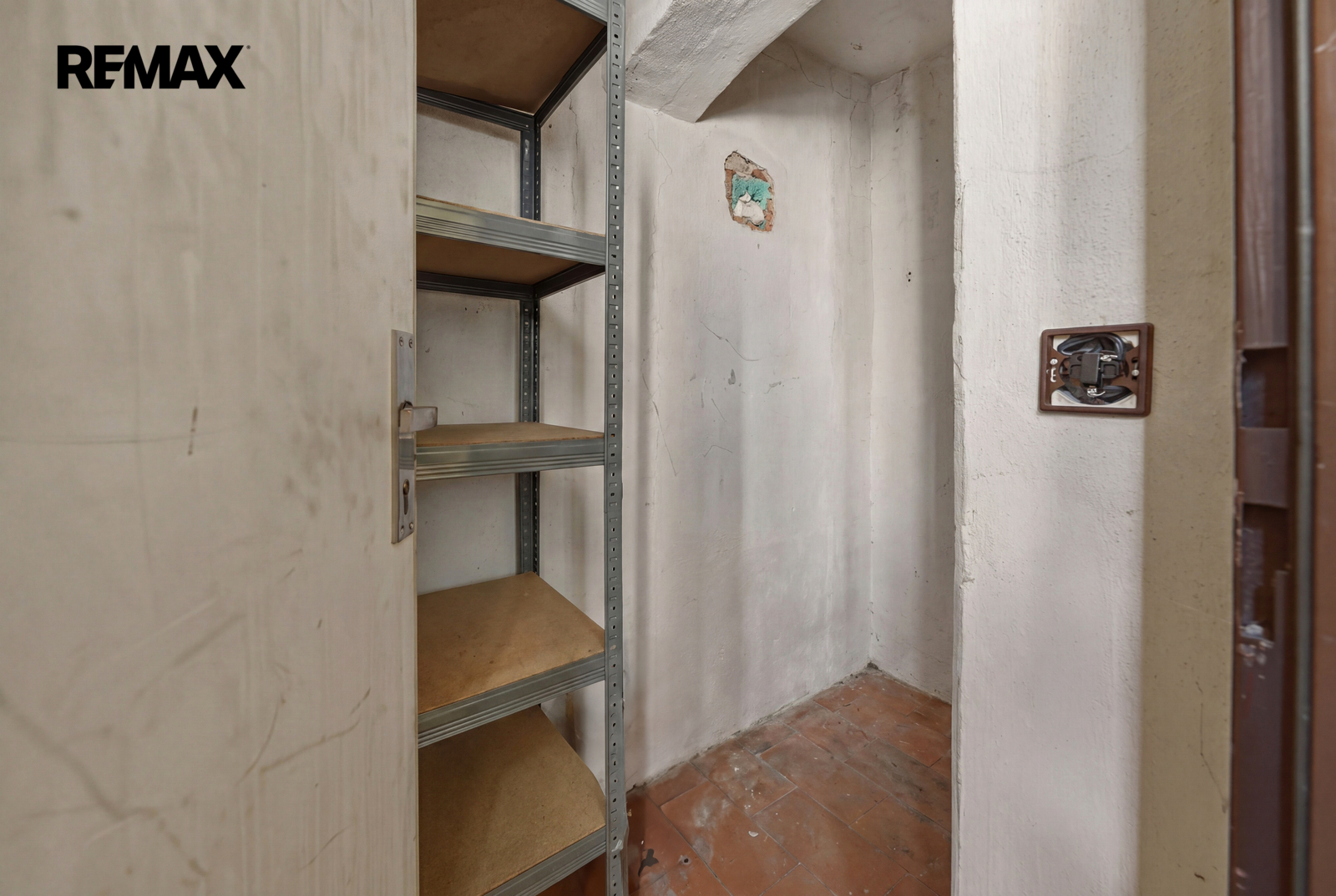 Velkou výhodou je praktické zázemí v podobě sklepní kóje a komory umístěné v mezipatře, které poskytují dostatek úložného prostoru. Obyvatelé domu mohou dále využívat společnou půdu přímo vedle bytu a také zahradu za domem.