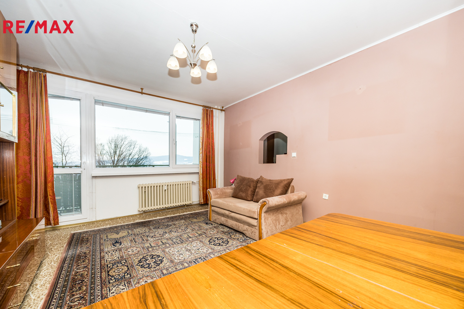 Jeden z pokojů (v půdorysu v inzerci je označen číslem 8, výměra 15,8 m2) má dělené okno a dva radiátory a je tak možné jej rozdělit příčkou na dva menší pokoje a dosáhnout dispozice 4+1.