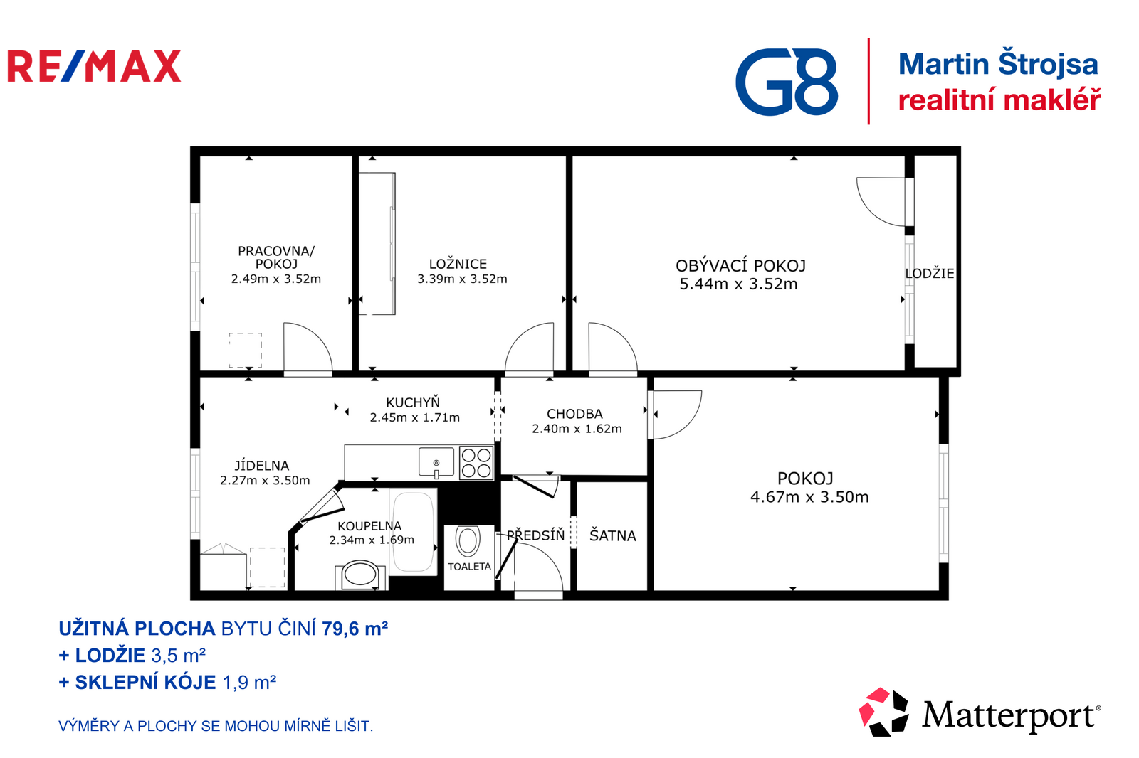 Celková užitná plocha bytu činí 79,6 m² + lodžie o velikosti 3,5 m² a sklepní kóje 1,9 m². Dispozice byla upravena na plnohodnotné 4+1, což znamená čtyři samostatné pokoje – ideální řešení pro větší rodinu s dětmi, kde má každý svůj vlastní prostor.