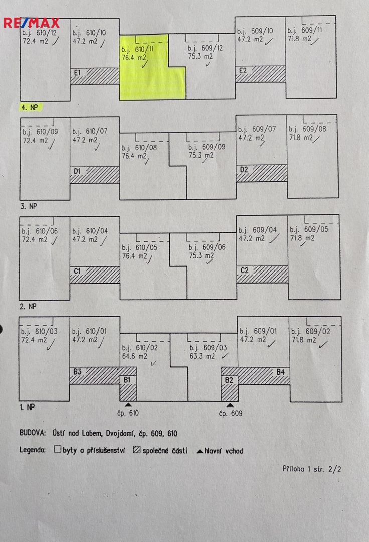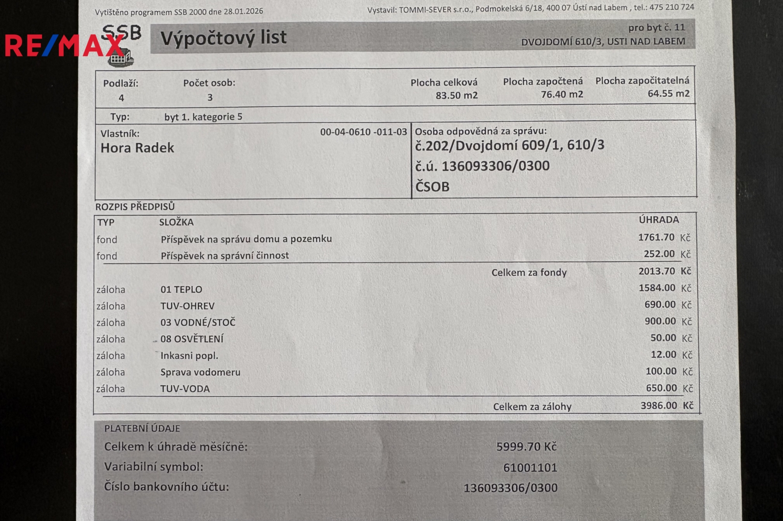 Ulice Dvojdomí, kde stojí panelový dům ve kterém vám nabízím tento byt stojí v horní partii sídliště Krásné Březno. Za domem je už jen zeleň, před dome výhled do údolí. Je to klasické sídliště s veškerou občanskou vybaveností. Spojení do dalších částí města vám zajistí zastávka MHD přímo pod domem. V čem musíte být benevolentní jsou tak trochu omezené možnosti parkování. Sídliště vzniklo v době, kdy ne všichni měli v rodině dvě auta. Byt je umístěn ve 4. patře. Dům však nemá výtah, takže i s tím musíte počítat. Uvažuje se o zbudování externího výtahu, to je ale zatím jen v rovině úvah. Byt má k dispozici přípojky plynu a samozřejmě dalších energií jako elektřina, voda a topení. Byt je osazen plastovými okny, které směřují k jihu - kuchyně, obývací pokoj s lodžií. Severní strana patří ložnicím, což oceníte nejenom v létě. Ložnice na sever jsou odkloněny od hlavní silnice. Takže dvojí výhoda - v létě vás nebudí ostré slunce a přímý hluk městského života. Stav bytu je sice původní, avšak velmi dobře udržovaný s umakartovým jádrem. Nehraje si na nic víc než kým je. 71,1 m2 obytného prostoru plus lodžie 5,3 m2. Nepřeplácíte rekonstrukce, kterou byste možná ani nechtěli a museli byt znova upravovat. Zde je byt připraven na novou koupelnu, možná na novou linku. Zbytek už je dán dispozicí. Prostorná hlavní chodba vás provede celým bytem. Z ní jsou samostatné vstupy do jednotlivých ložnic. Obývací pokoj je propojen jak s chodbou tak kuchyní. Doporučuji tento byt i vzhledem k nákladům, které jsou s bytem spojeny - 1761,-Kč fond oprav. A 252,-Kč správa domu, což je velmi solidní cena za klidné spaní. Teplo 1584,-Kč a zbytek položky jako voda, osvětlení domu apod. Zápočtový list pro r. 2026 na 3 osoby všeho všudy za 5 999,-Kč.