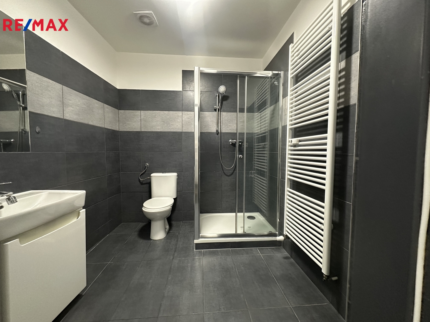 V prostorné koupelně se sprchovým koutem, toaletou a skříňkou je dostatek prostoru pro pračku i uložení čistících prostředků.