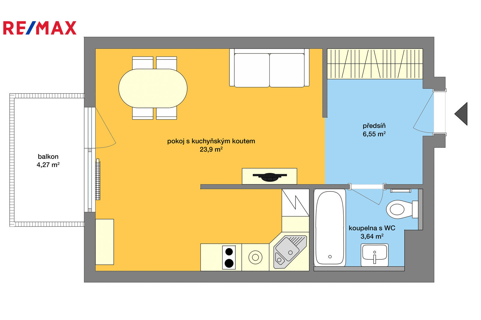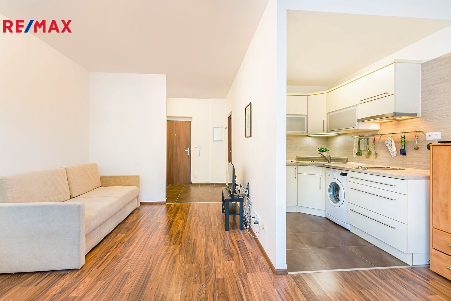 Dispozice bytu je prakticky řešena (viz půdorys mezi fotografiemi). Předsíň s kuchyňským koutem je od obytné části částečně oddělena příčkou, což zvyšuje komfort užívání prostoru. Byt se pronajímá bez nábytku. V předsíni je k dispozici velká vestavěná skříň o rozměrech 209 × 230 × 65 cm (š × v × h), která poskytuje dostatek úložného prostoru. Kuchyňská linka je vybavena sklokeramickou varnou deskou a lednicí. Koupelna je vybavena vanou, umyvadlem se zrcadlovou skříňkou a toaletou. Podlahy v obytné části tvoří plovoucí laminátová podlaha, v předsíni, kuchyni a koupelně je položena keramická dlažba.