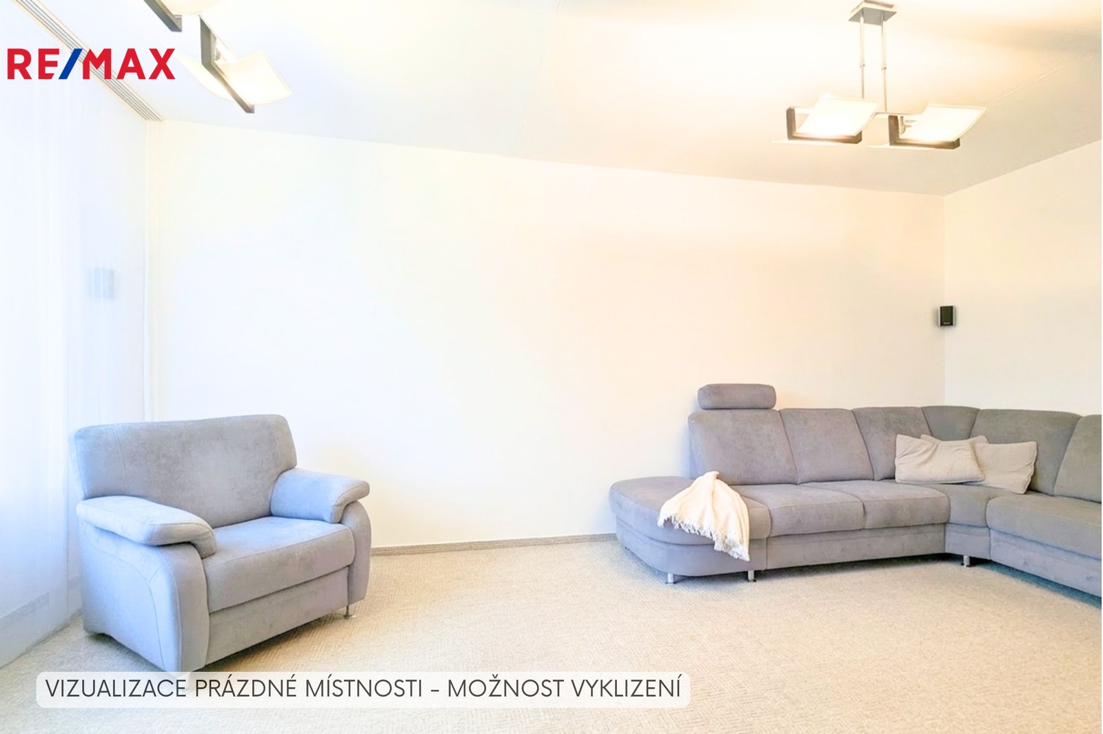 • Prostorný obývací pokoj se dvěma vstupy a výhledem do zeleně, rohová sedačka, TV a domácí kino.