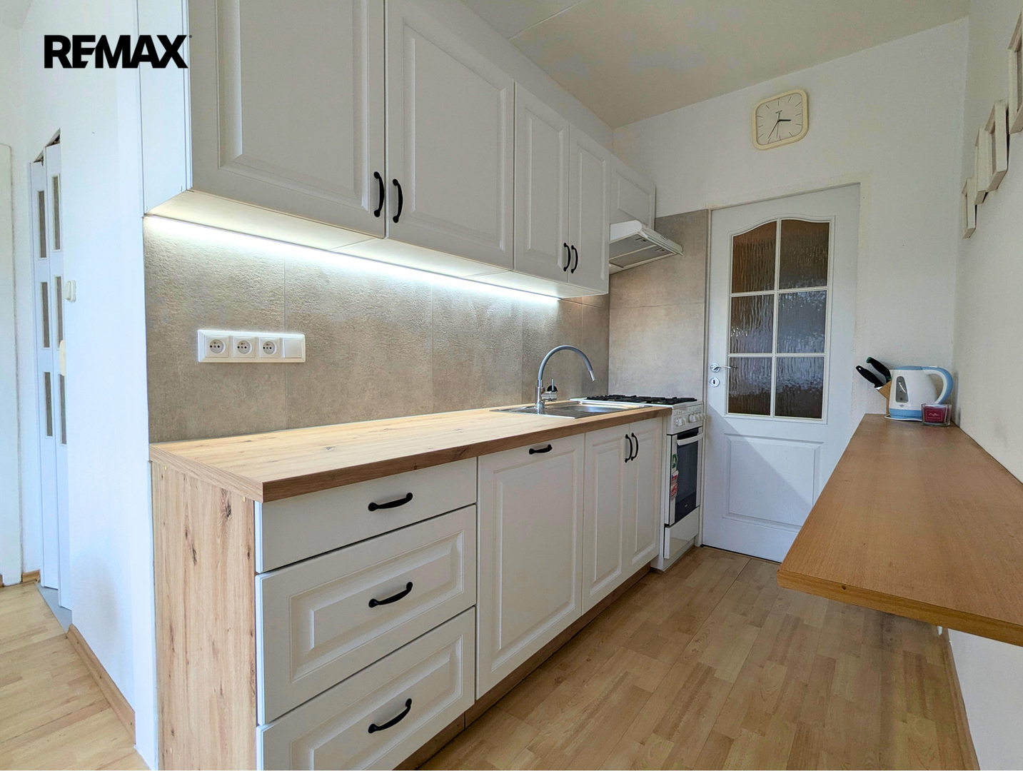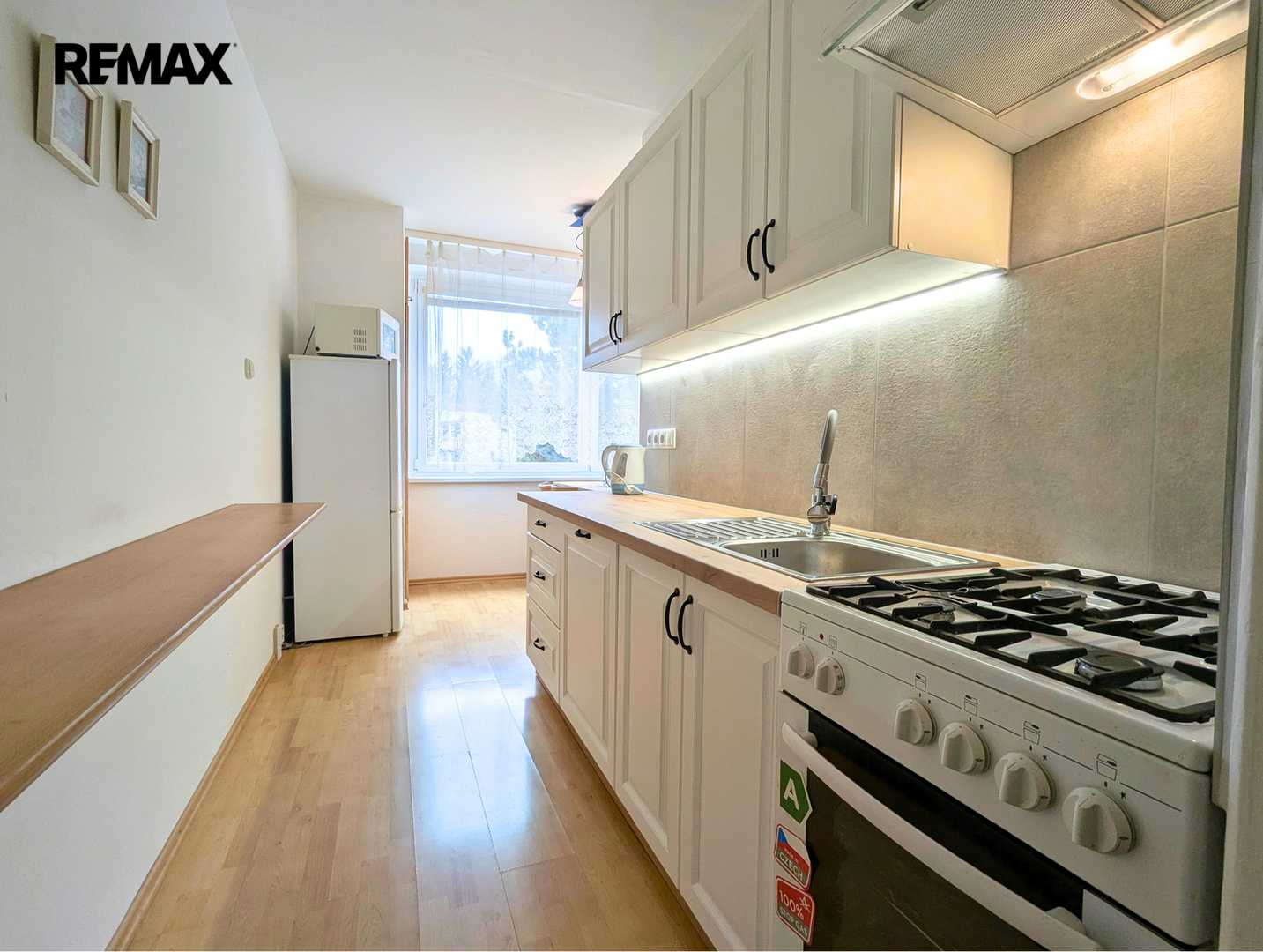 • Nová kuchyň – oproti fotografiím – ještě před nastěhováním bude doplněna nová myčka na nádobí a kompletně vyměněná kuchyňská linka vč. dřezu a pracovní desky. Samotná kuchyň je prakticky zařízená – jídelní kout, vestavná spíž, lednice s mrazákem, mikrovlnná trouba, plynový sporák s troubou a digestoří.