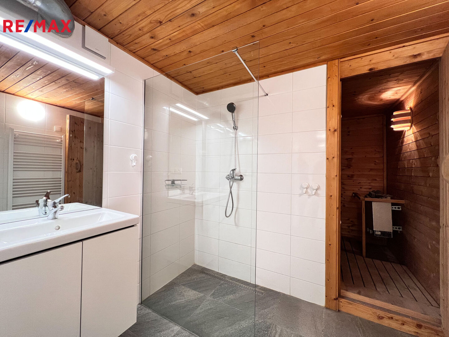 Okna bytu jsou situována na jihozápad a tak můžete využít příjemného slunečního svitu. Zajímavostí či unikátem bytu je soukromá elektrická sauna s odděleným elektroměrem a dveřmi hned vedle sprchového koutu. Pokud tedy milujete saunování, vyhřátá sauna a ledová sprcha jsou jen tři kroky od sebe.