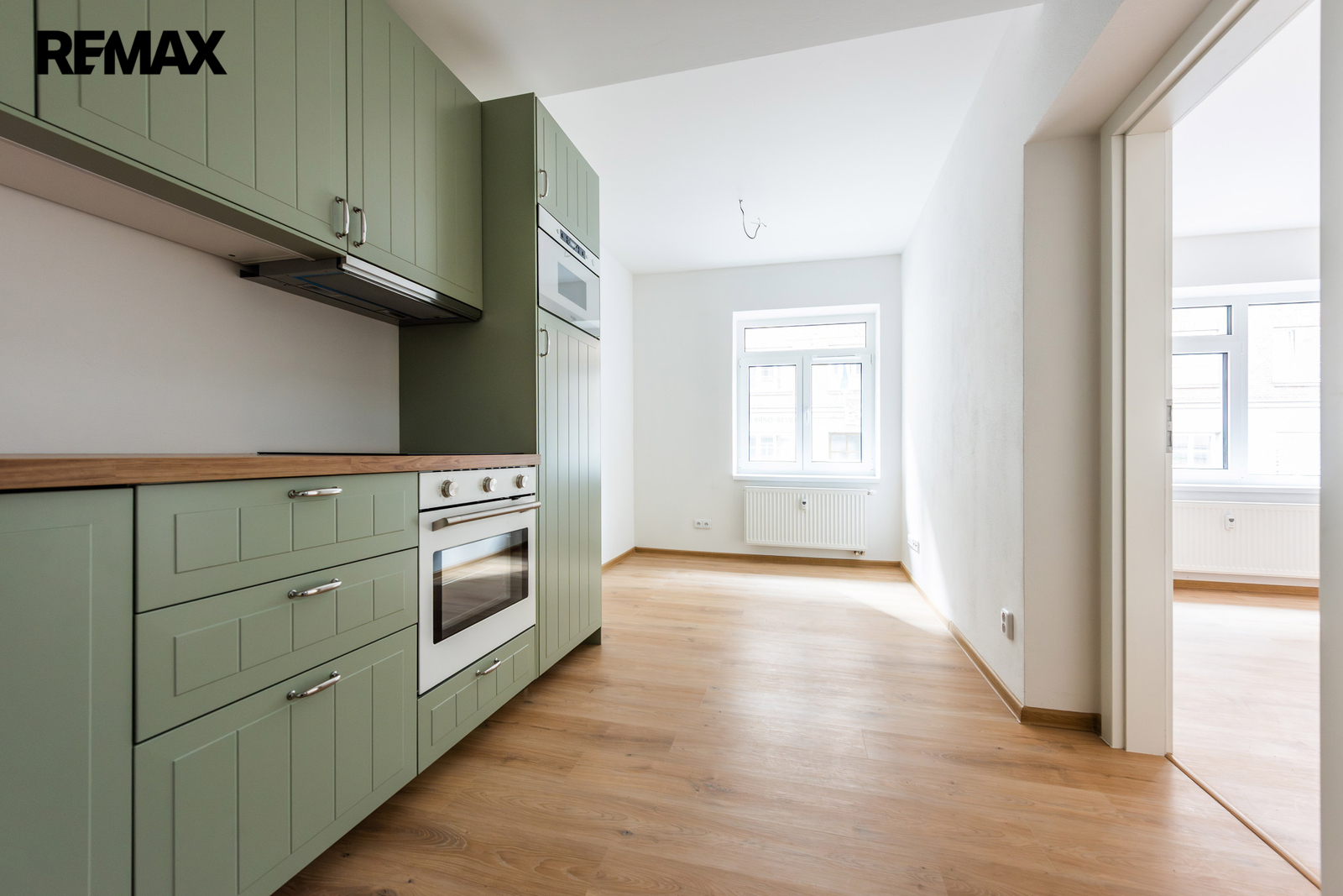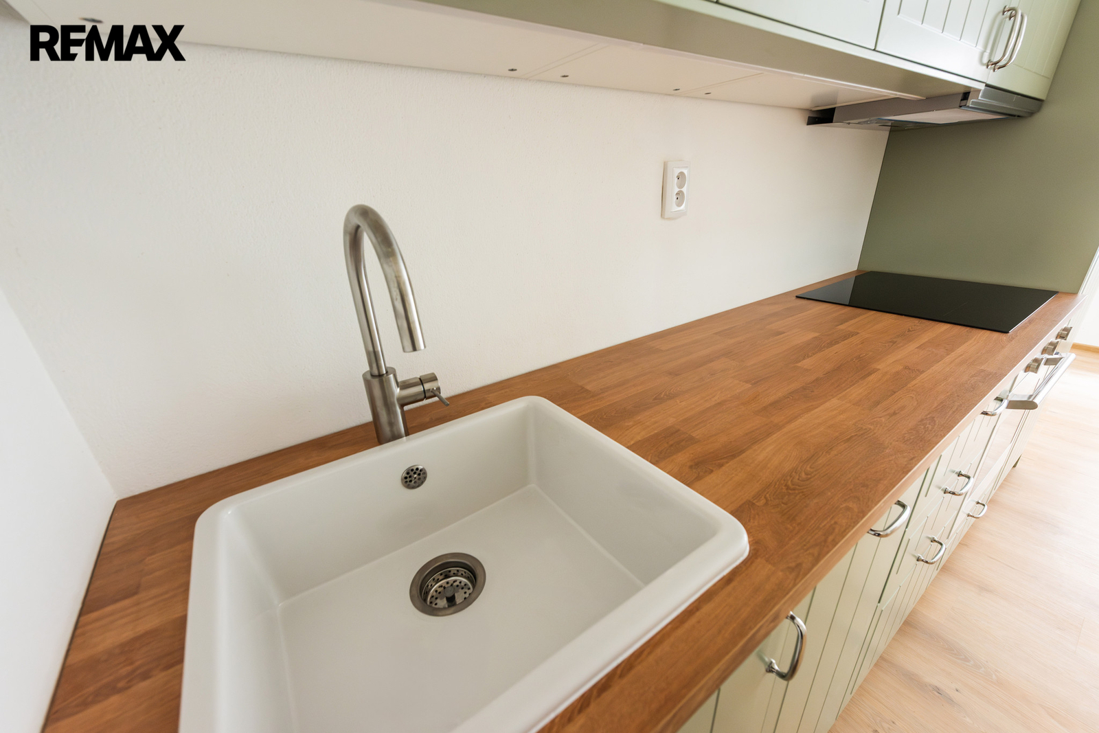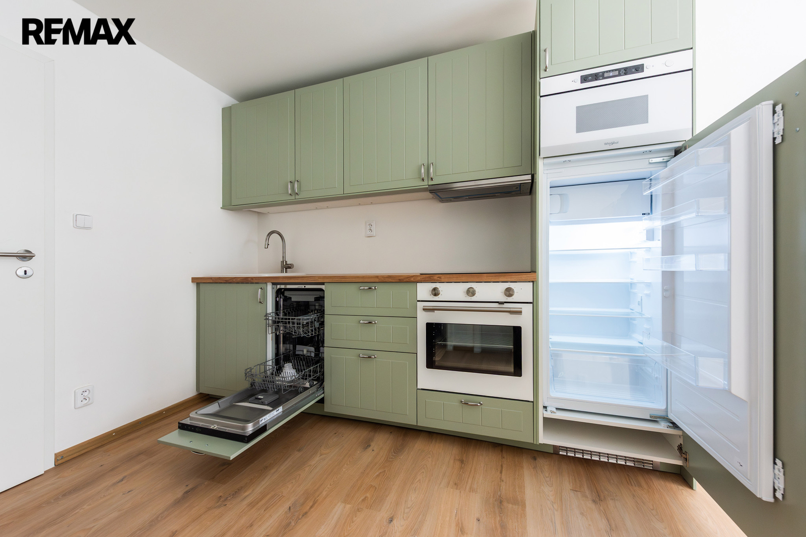 Kuchyňská linka je nová a vybavená vestavnými spotřebiči – myčkou, lednicí a digestoří.