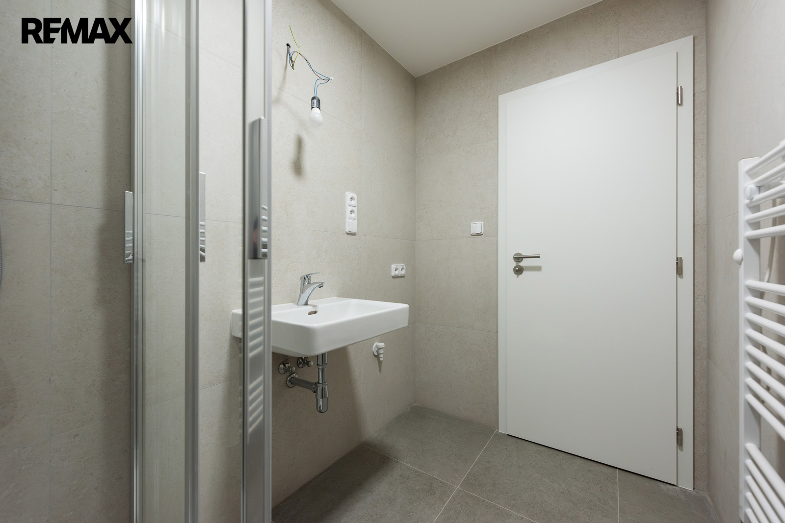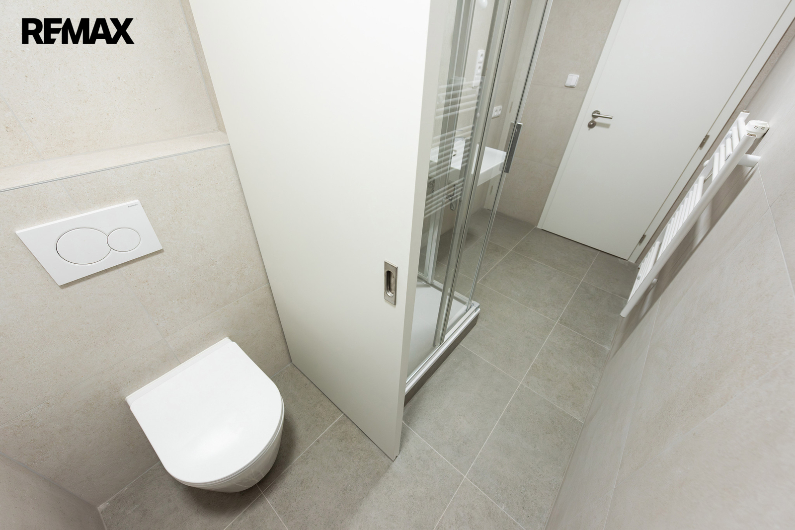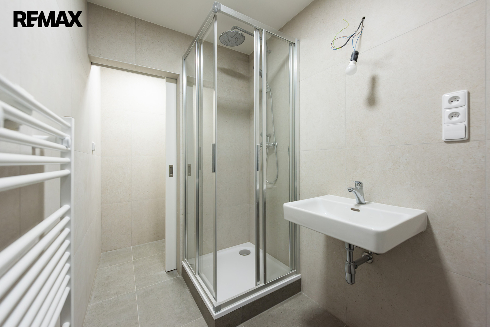 Koupelna je vybavena sprchovým koutem, toaletou a nabízí dostatek prostoru i pro pračku a sušičku.