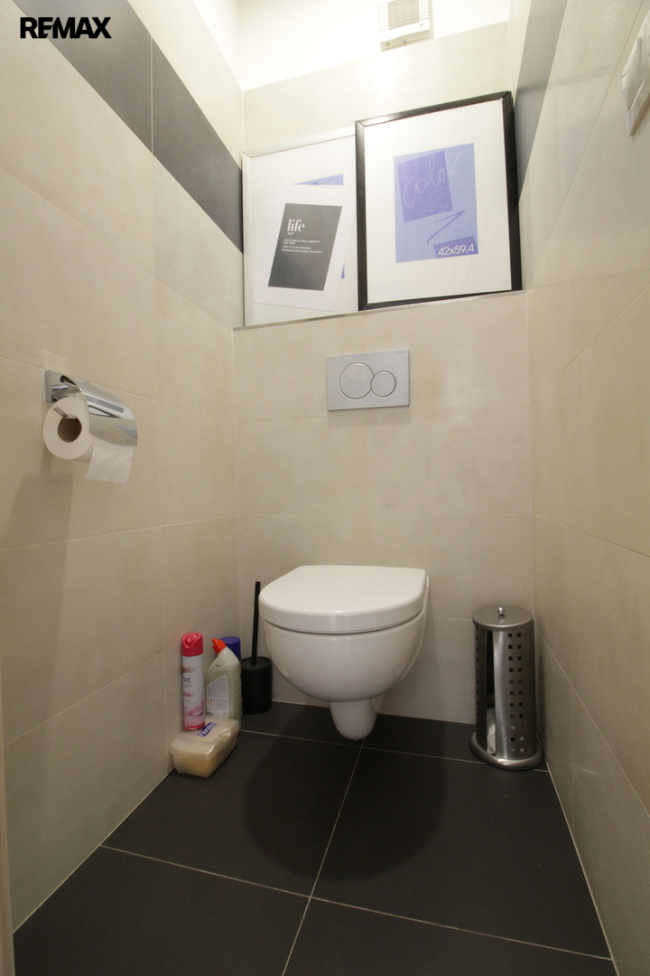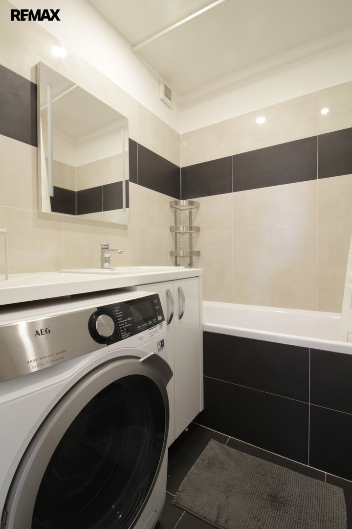 Vkusnou rekonstrukcí prošlo také sociální zázemí bytu - čistá a vkusná koupelna s vanou + samostatné WC. Velkou výhodou pro každodenní chod domácnosti je pračka se sušičkou, která je součástí vybavení. Úložné prostory jsou v tomto bytě vyřešeny nadstandardně – prostorná chodba nabízí dostatek vestavěných skříní, kam pohodlně uložíte vše potřebné, aniž byste museli zaplňovat obytné místnosti dalším nábytkem.
