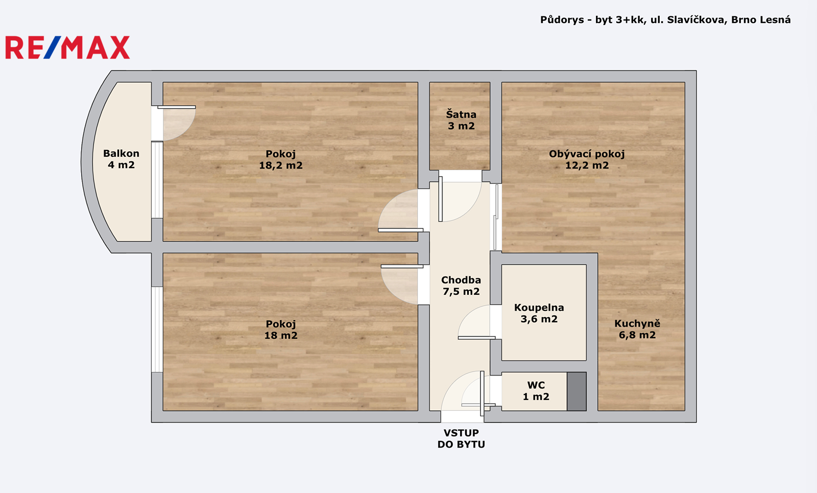 Z prostorné předsíně s botníkem a zrcadlem se dostanete do všech samostatných pokojů o rozloze 18, 18,2 a 12,2 m2. Z největšího z pokojů je vstup i na balkón o rozloze 4 m2, ze kterého je nádherný výhled na Brno a západ slunce.