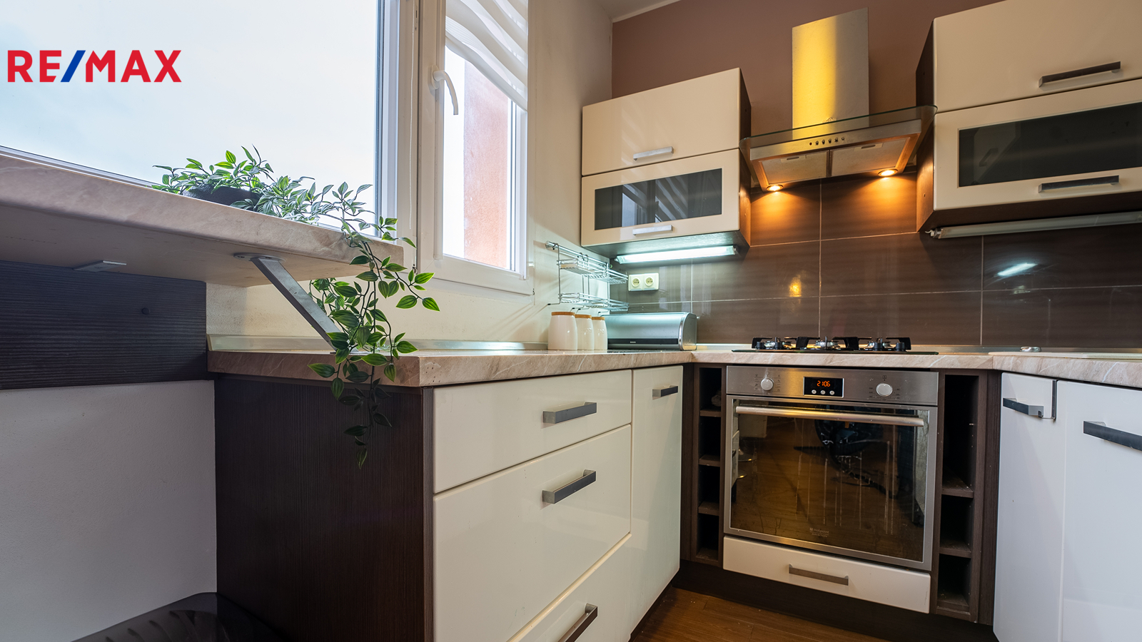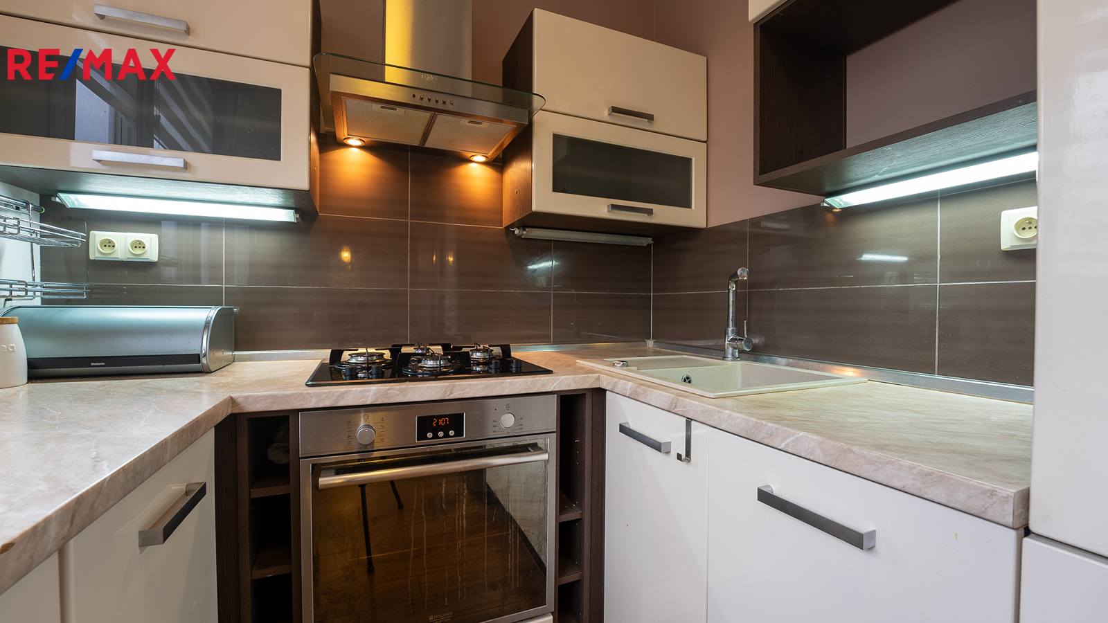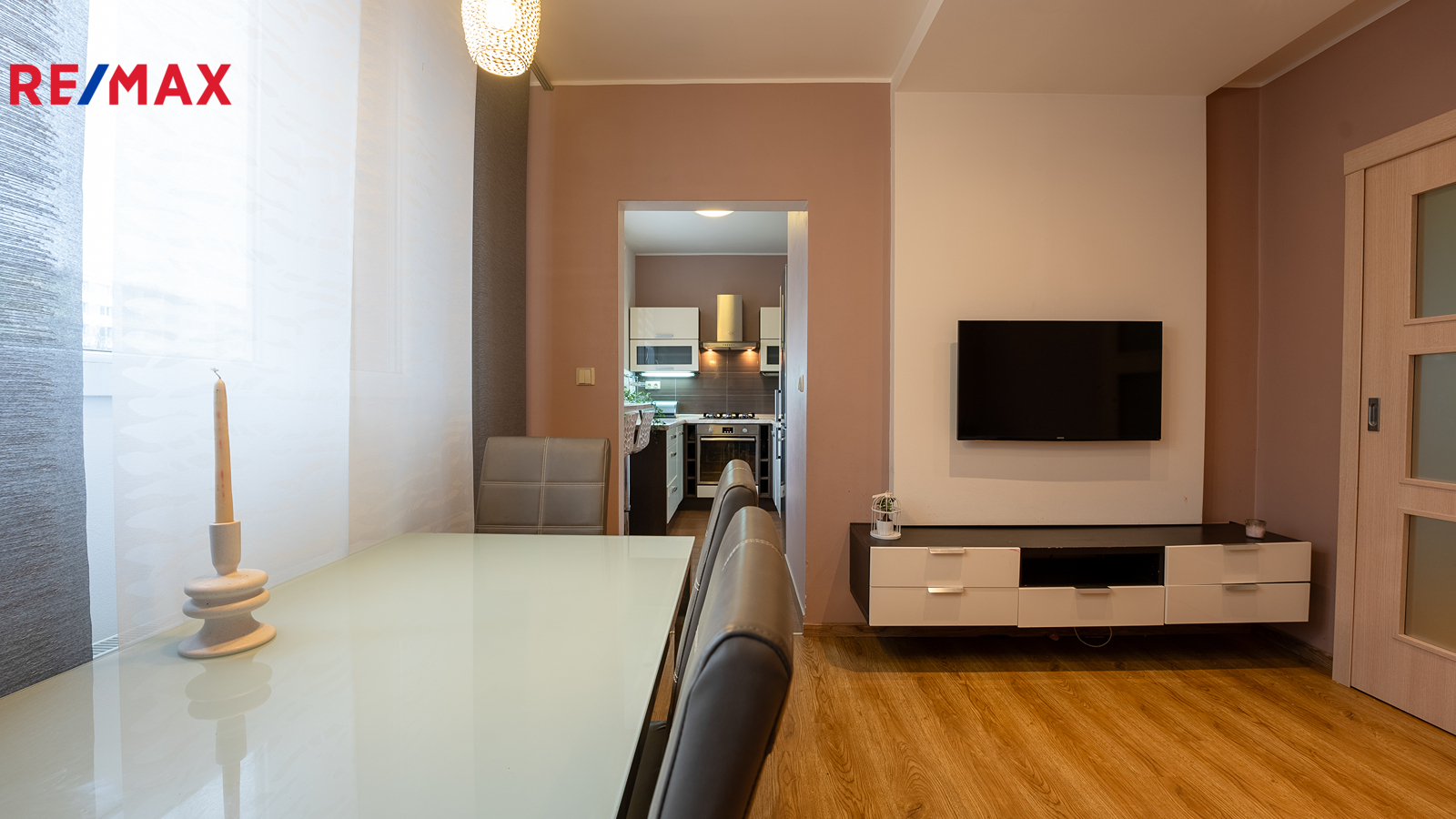 Z obývacího pokoje se sedací soupravou, konferenčním stolkem, stolkem na televizi, televizí a jídelním stolem se židlemi, je vstup do kuchyně vybavené veškerými spotřebiči (lednice s mrazákem, myčka, plynový sporák s troubou, digestoř) a kuchyňskou linkou s dostatkem úložného prostoru a také snídaňovým pultem.