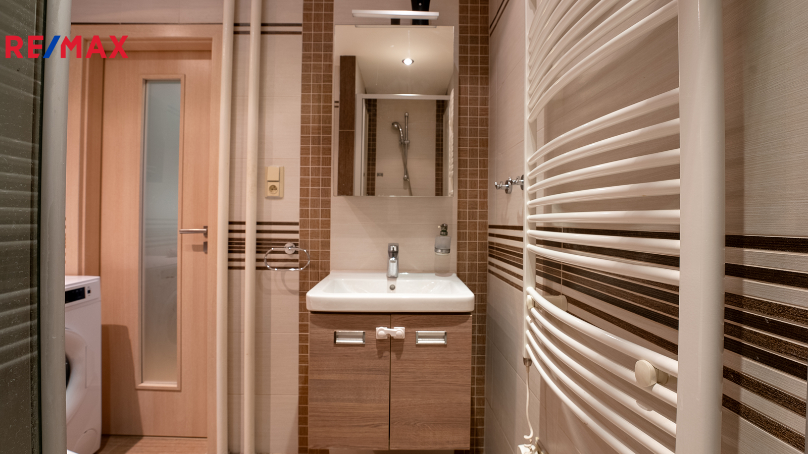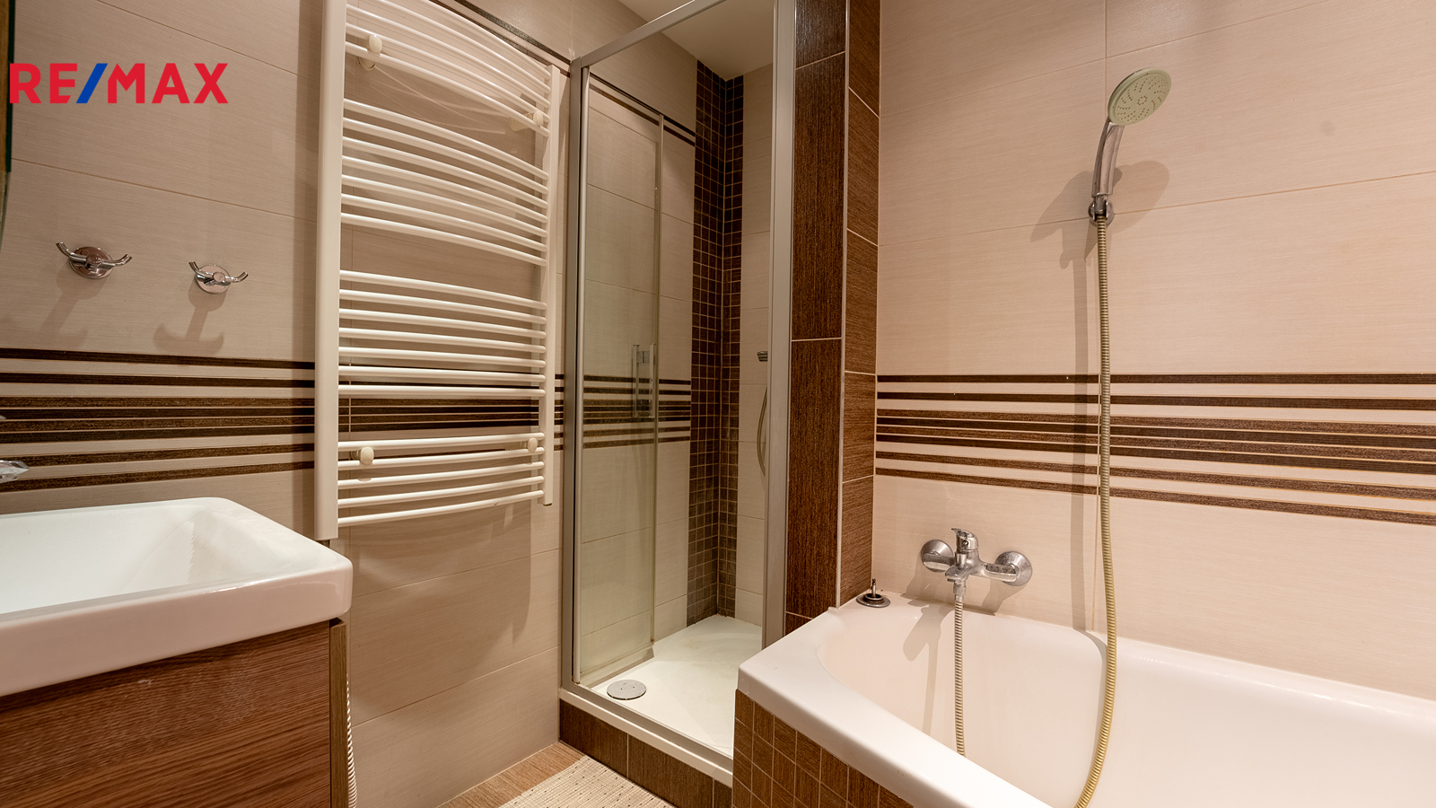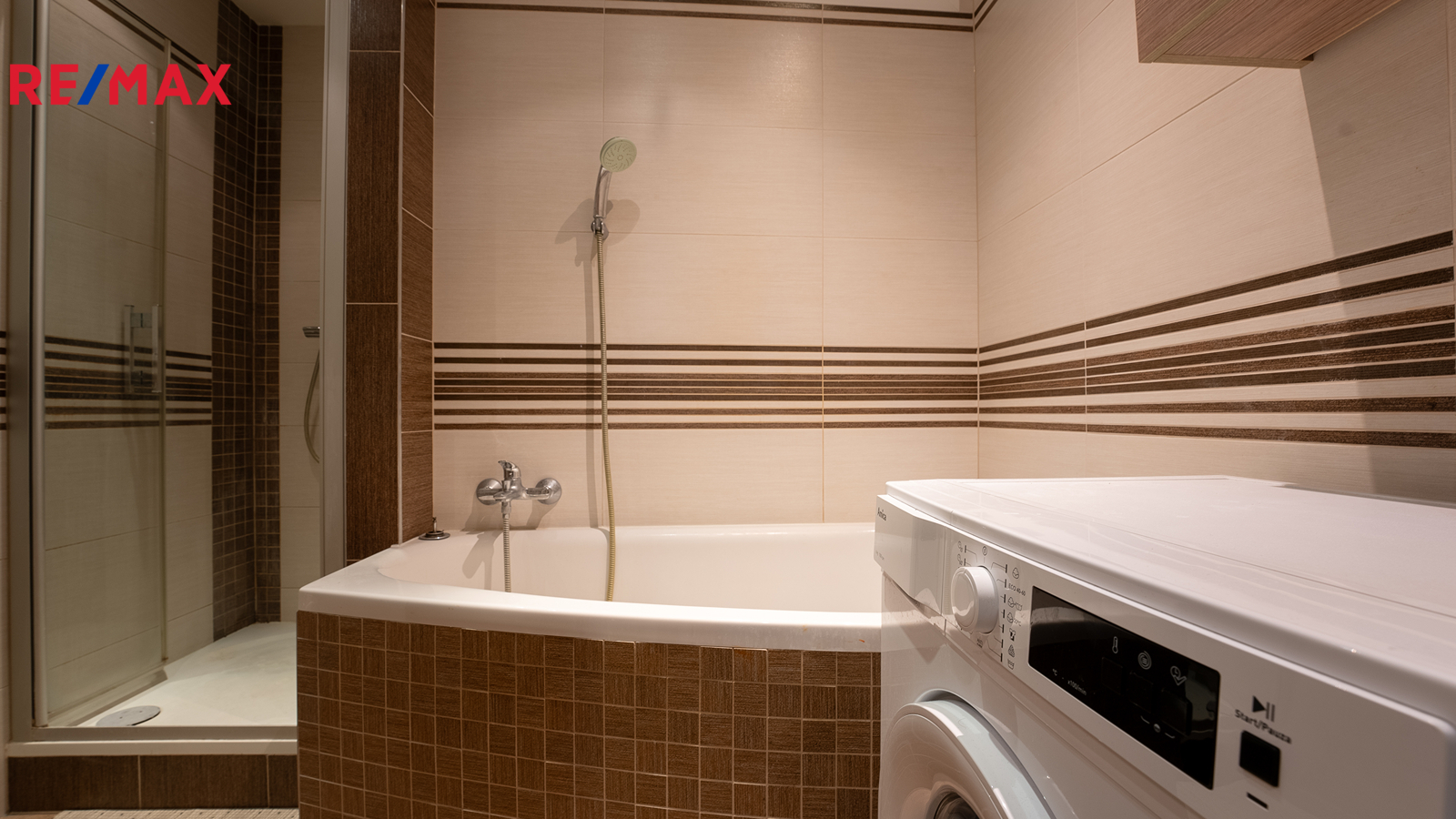 V koupelně najdete nejen umývadlo se zrcadlem a skříňkami, ale přijdou si tu na své vyznavači vany i sprchového koutu.