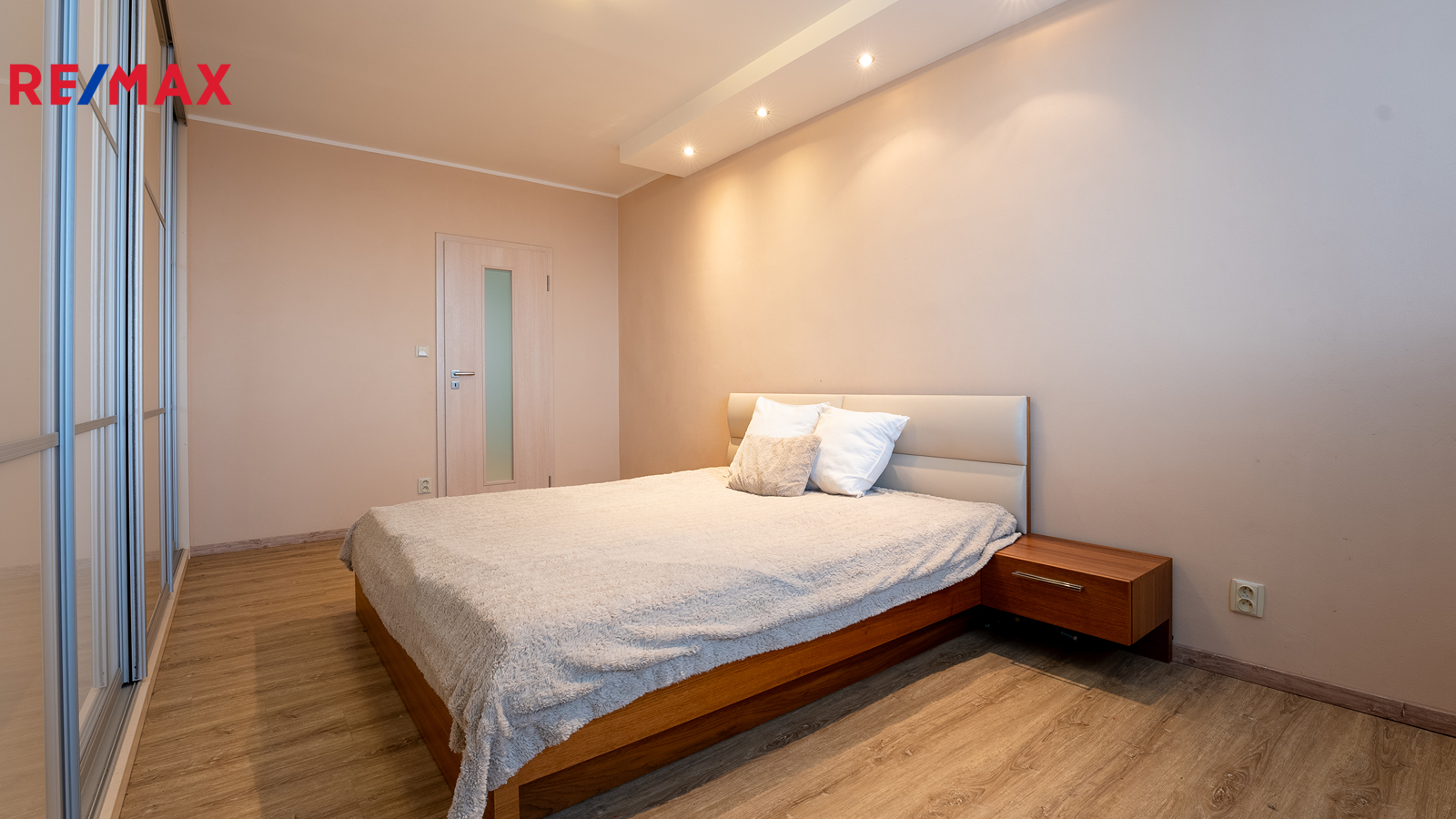 V ložnici je vestavěná skříň a dvojlůžko se stolky.