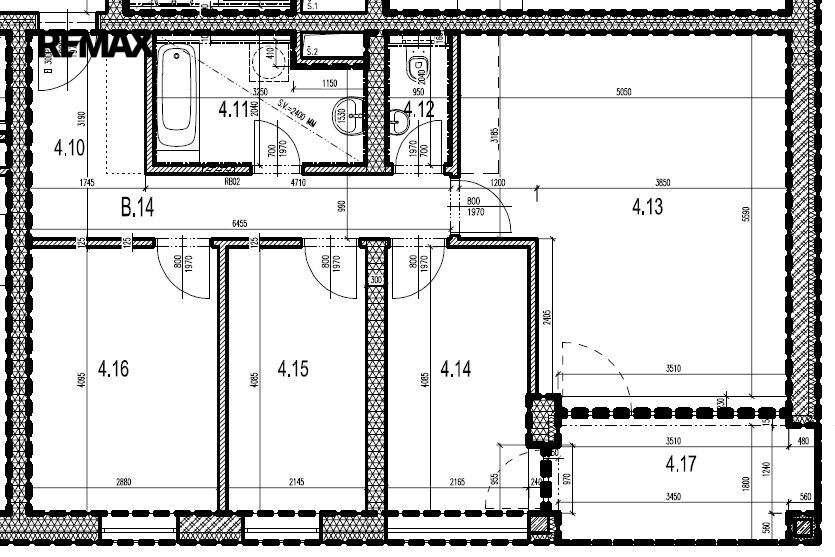 Byt se skládá z: obytné místnosti s kuchyní (26,15 m2), ložnice (11,79 m2), ložnice (9,07 m2), pokoje (8,76 m2), koupelny s vanou (5,83 m2), samostatného WC (1,79 m2), předsíně (10,23 m2) a terasy (7,48 m2).