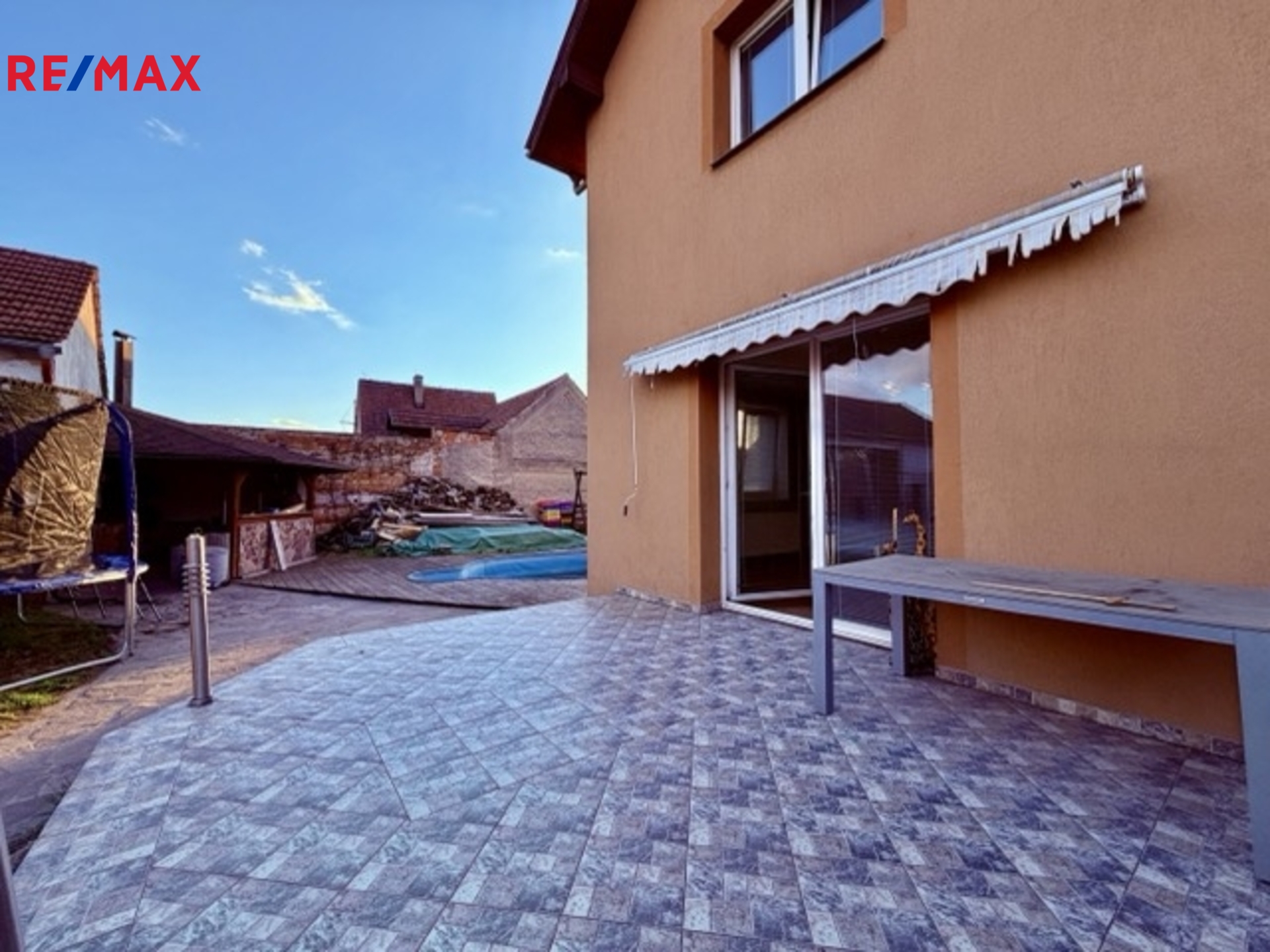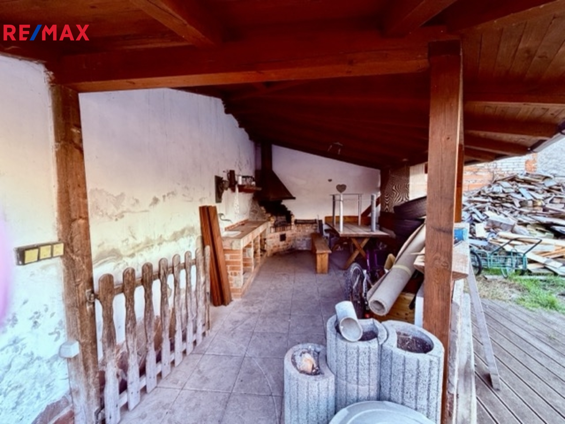 K bytu náleží terasa. Po dohodě je možné využívat také zahradní posezení pod přístřeškem a bazén. Zahrada je sdílená s majiteli horního bytu.
