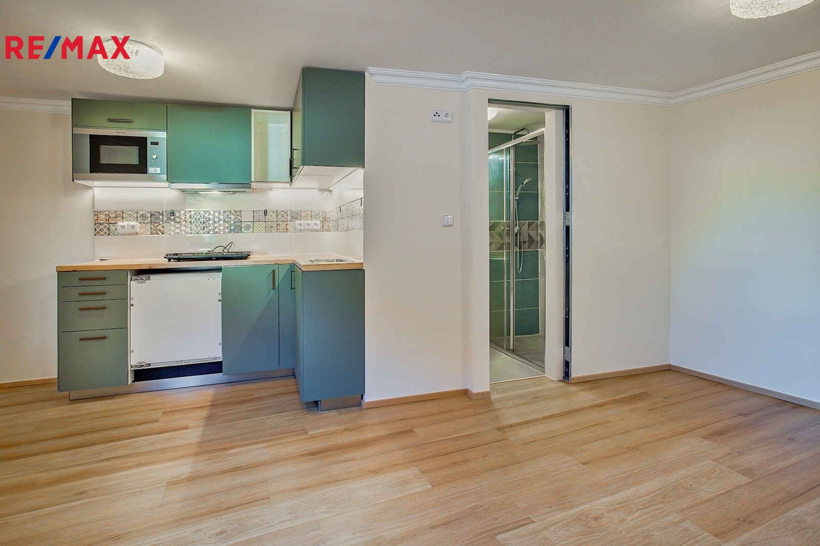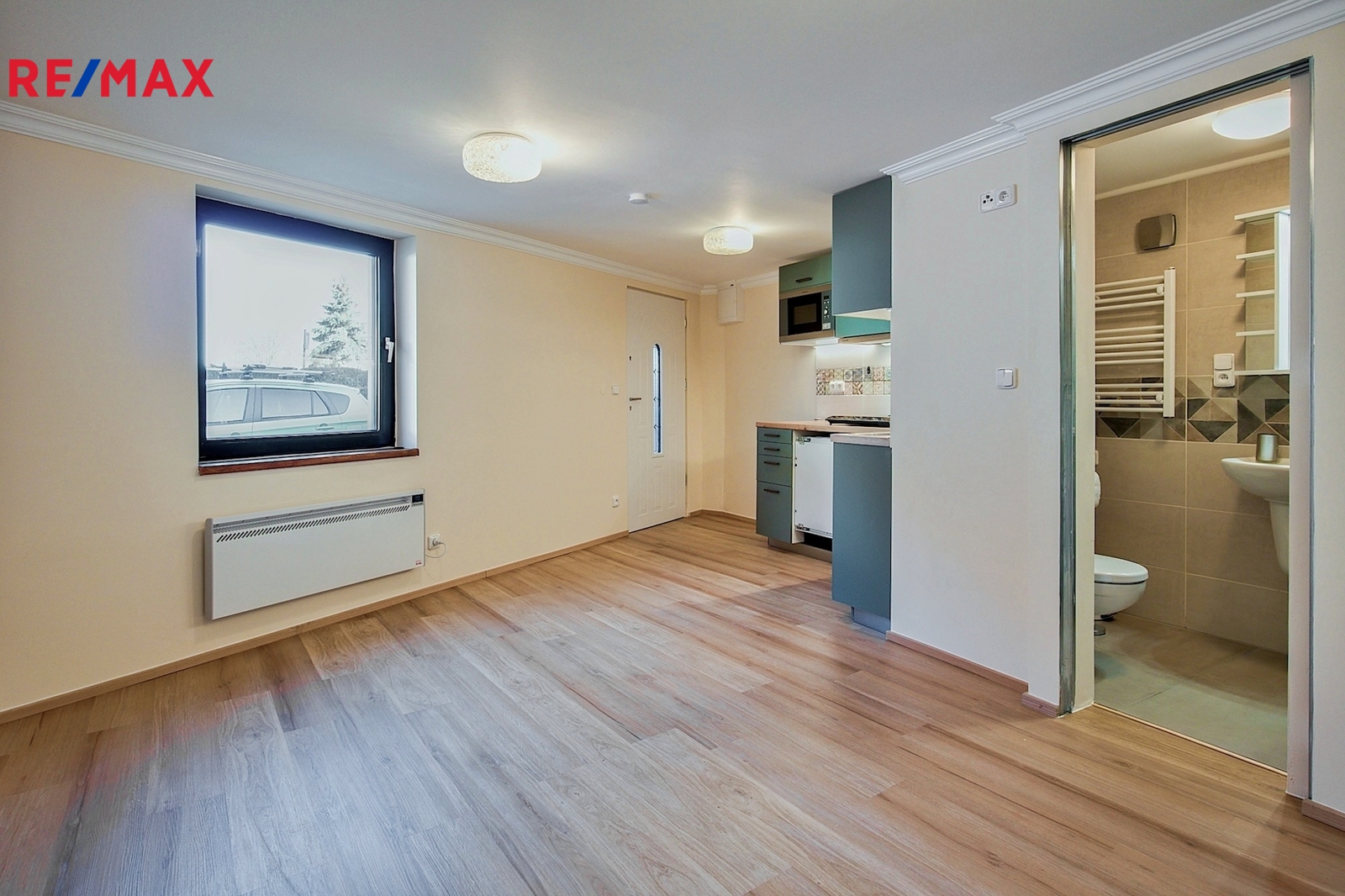Byt je umístěn na zahradě rodinného domu, v samostatném zděném a zatepleném domku s vlastním vstupem. Byt samotný má výměru 28 m2 a zahrnuje pokoj s kuchyňským koutem a koupelnu s WC. Kuchyň je vybavena vestavěnou ledničkou, digestoří a dvou plotýnkovým vařičem.