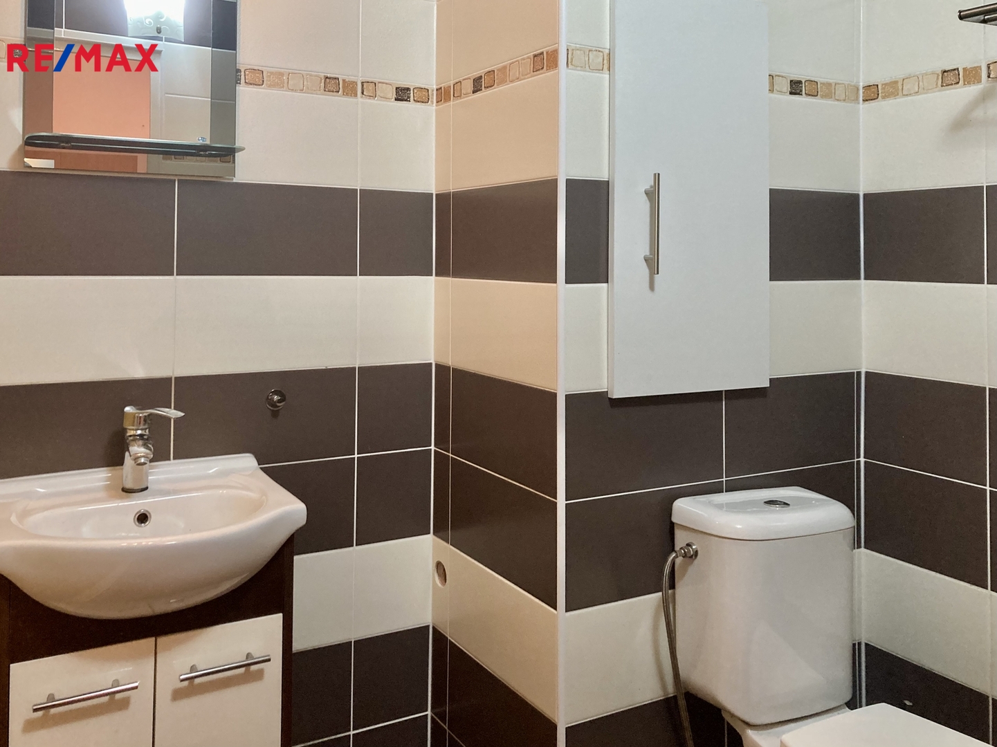 Byt prošel v minulosti rekonstrukcí bytového jádra, kdy došlo ke spojení toalety s koupelnou, která je obložena keramickým obkladem, vybavena sprchovým koutem.