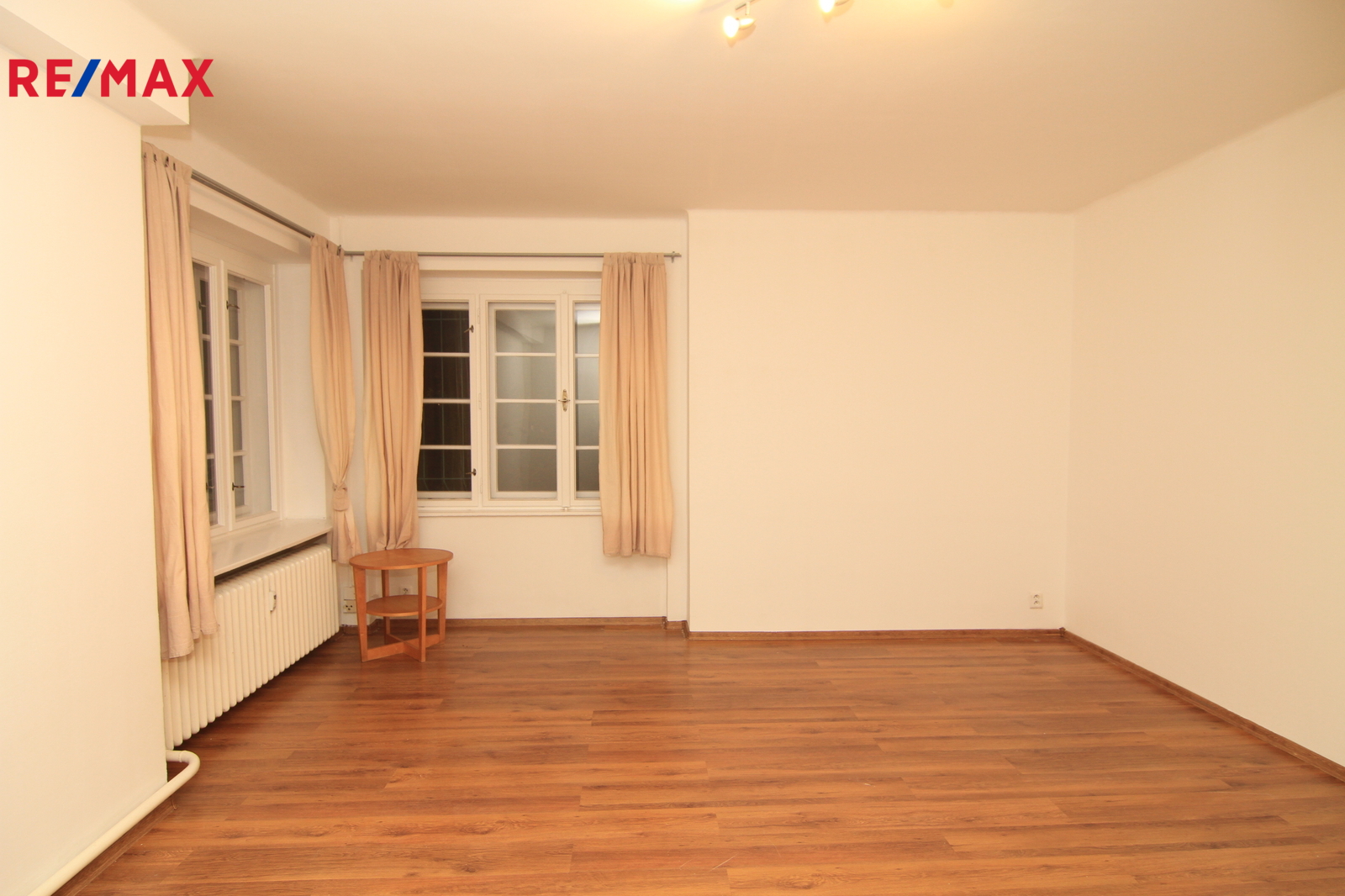 • Prostorný obývací pokoj s laminátovou podlahou a dřevěnými rohovými okny, které dodávají interiéru jedinečný charakter.