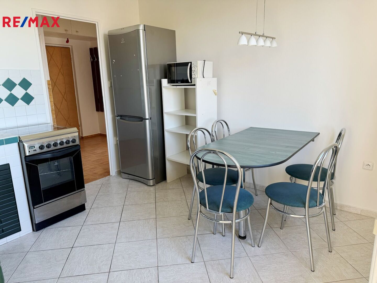 V kuchyni je kuchyňská linka s plynovým sporákem a el. troubou a jídelní stůl se židlemi. V obývacím pokoji dále konferenční stolek a obývací stěna.