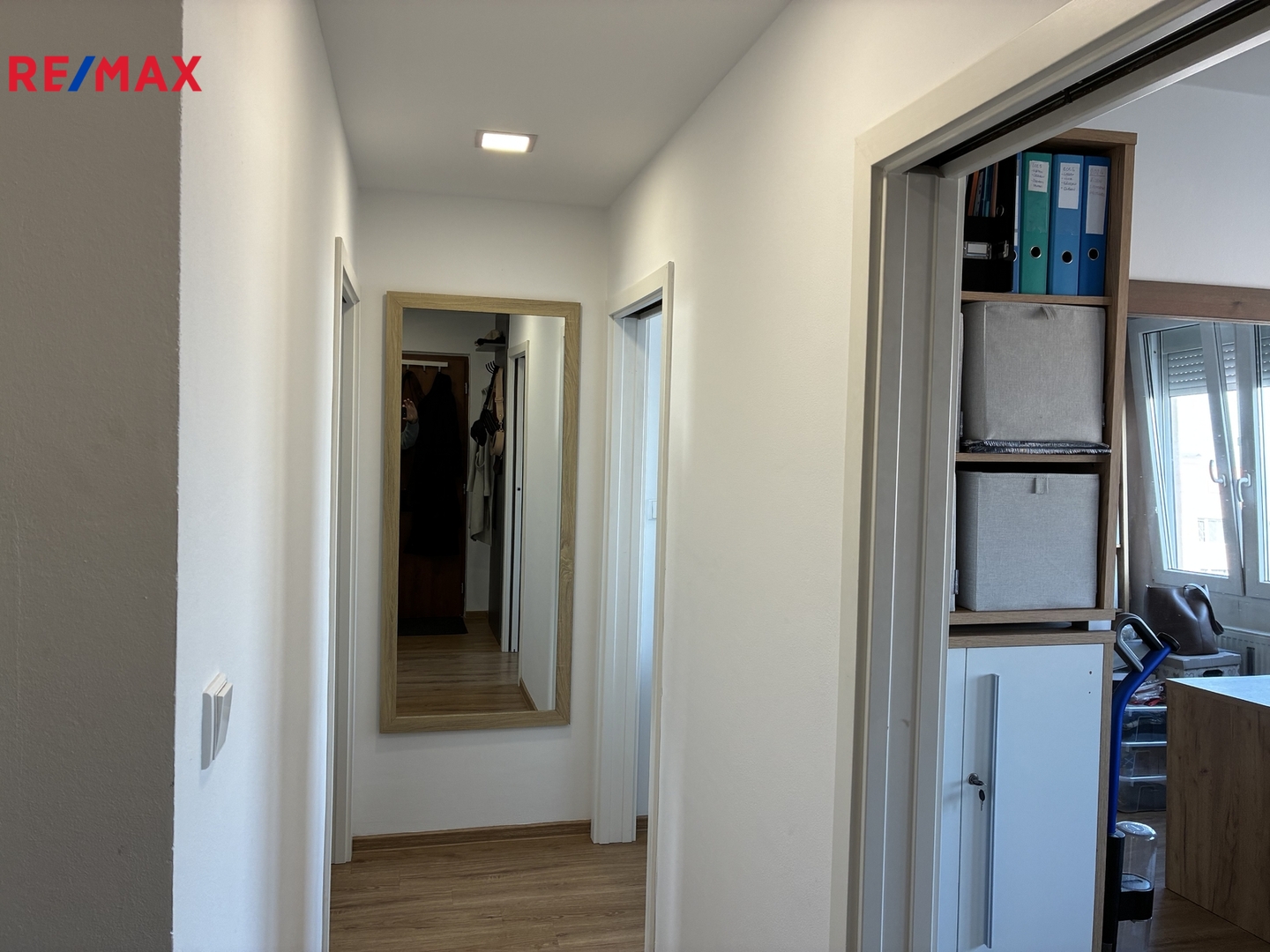 Z předsíně se jde do obou pokojů, na samostatné WC, do koupelny a do obývacího pokoje, který je spojený s kuchyňským koutem. Všechny dveře jsou nové s obloženými zárubněmi. V koupelně a na WC je dlažba, v ostatních místnostech je příjemný a snadno stíratelný vinyl. Kuchyňský kout je dělaný na míru, nabízí veškeré vestavěné spotřebiče (mikrovlnná trouba, myčka, lednička, varná deska apod.). V obývacím pokoji je vestavěná skříň, stolek, sedačka, TV a vstup na lodžii, odkud je krásný výhled. V koupelně je spojená pračka se sušičkou a sprchový kout. Oba zbývající pokoje je možné využít a přizpůsobit dle vlastního uvážení a potřeb jako pracovnu, ložnici, dětský pokoj....atd. V obou pokojích jsou venkovní žaluzie na dálkové ovládání, které vám úplně pokoje zatemní, což je ideální pro klidný spánek.