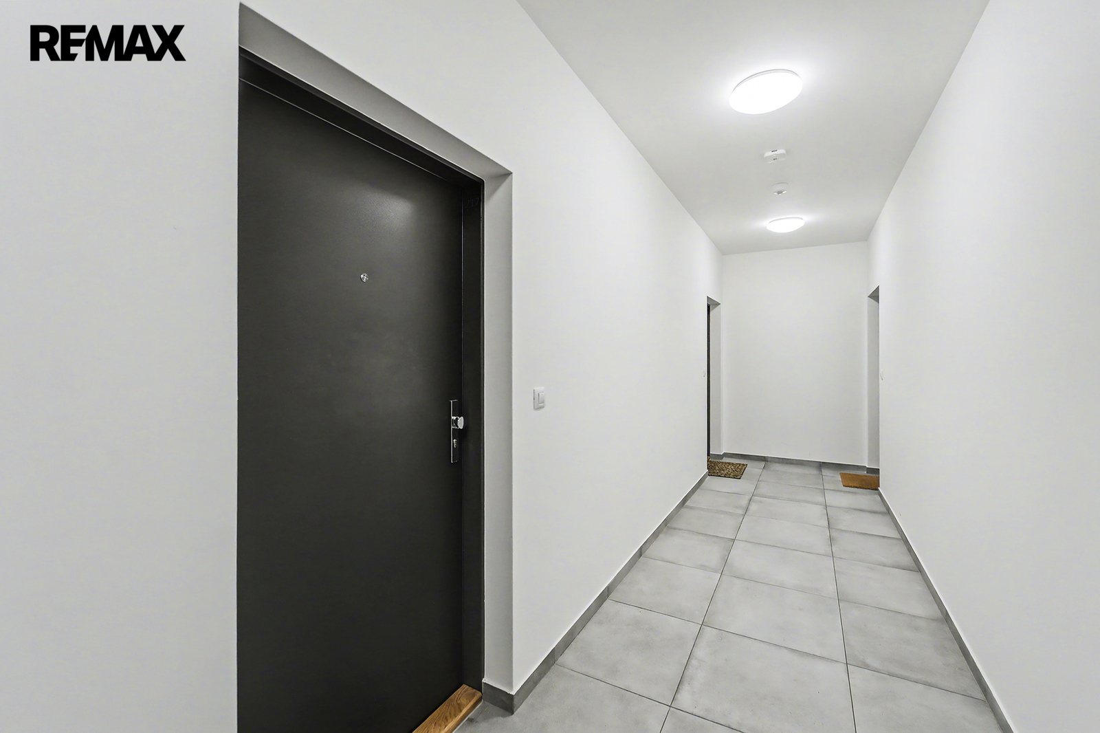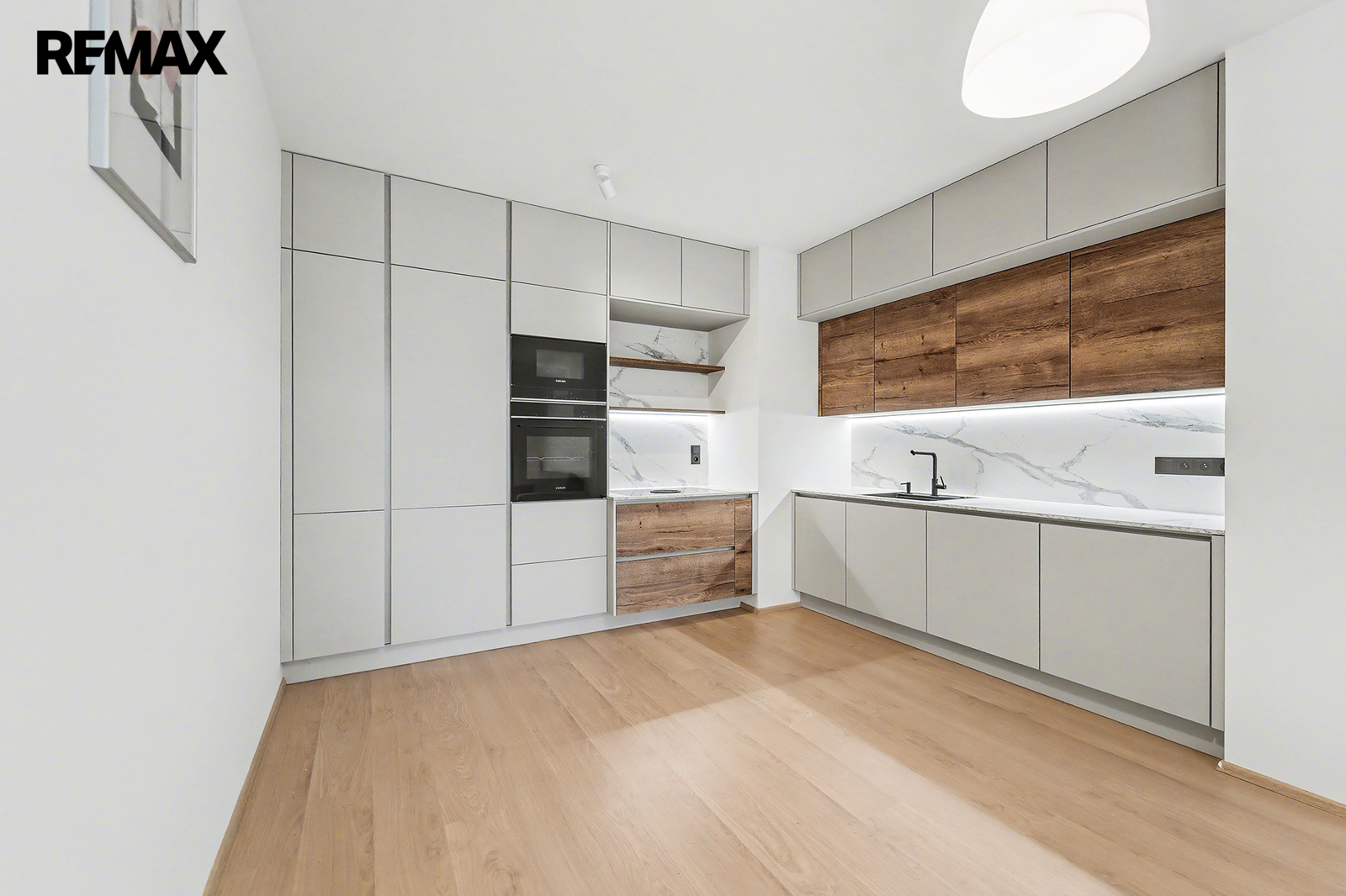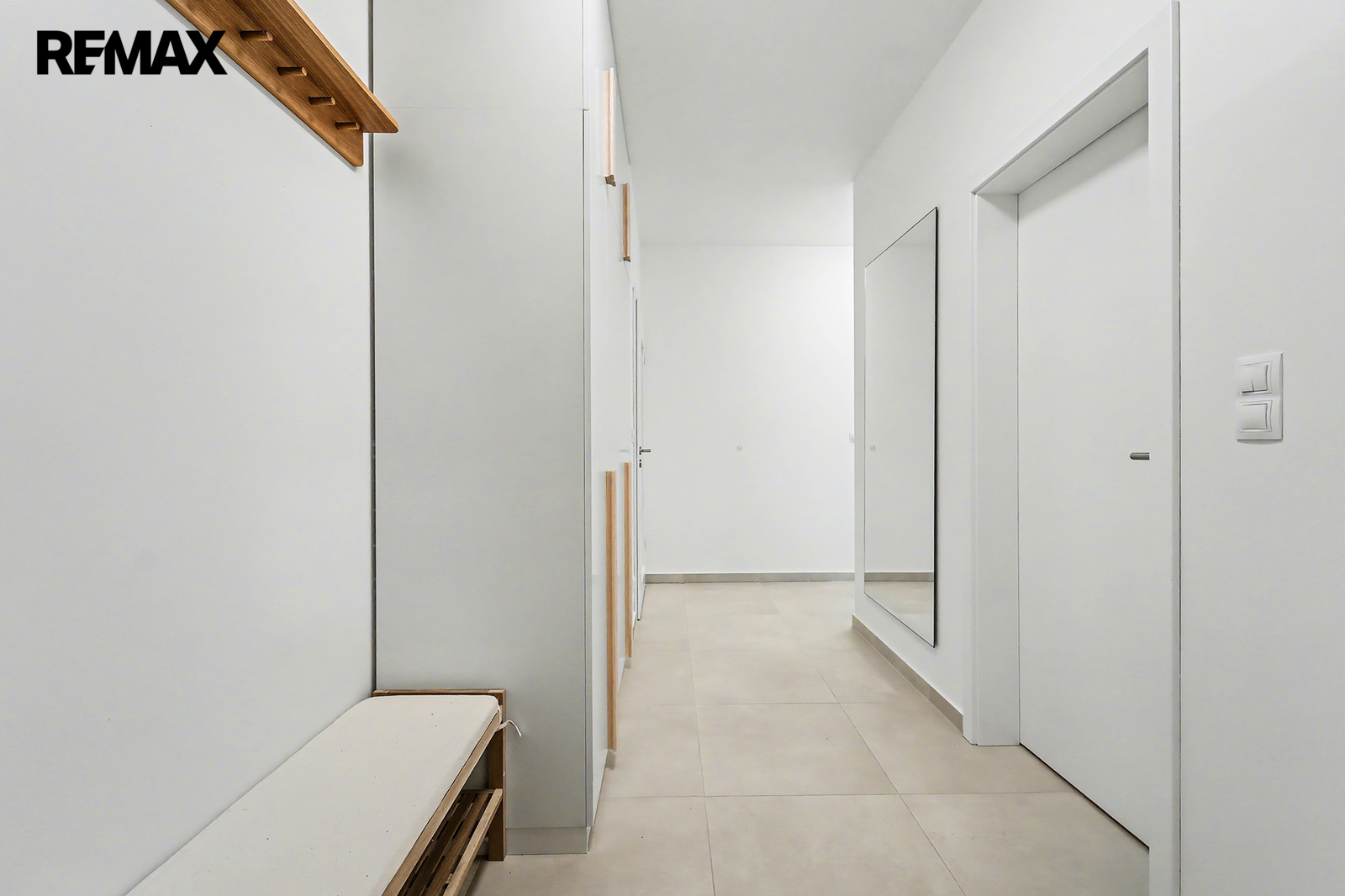 Byt byl zkolaudován v roce 2024 a hledáme první nájemníky. Byt se skládá z prostorné chodby o výměře 10,53 m², dvou koupelen (6,32 m² a 3,73 m²), obývacího pokoje s kuchyňským koutem o velikosti 26,25 m², šatny (3,52 m²), ložnice (12,97 m²), dalšího pokoje (14,96 m²) a pracovny (13,57 m²).