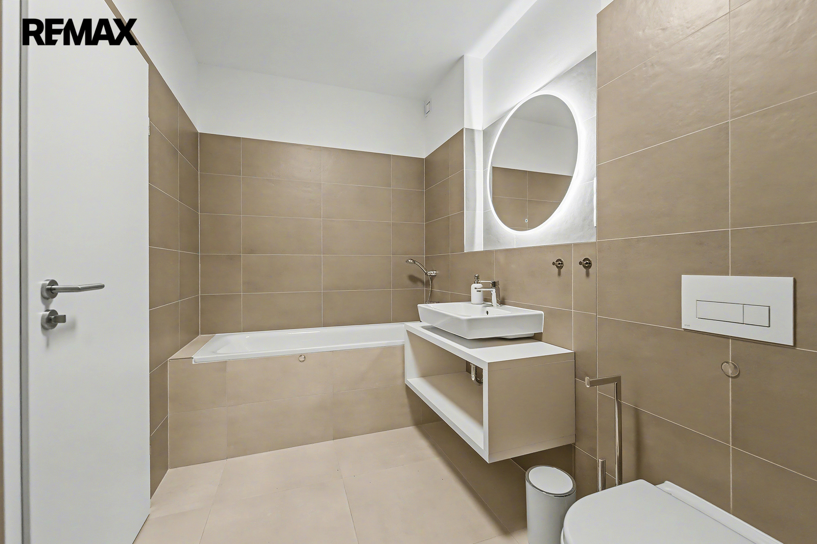 Velkou výhodou jsou také dvě koupelny – jedna s vanou a dostatkem prostoru pro pračku i sušičku, druhá se sprchovým koutem.