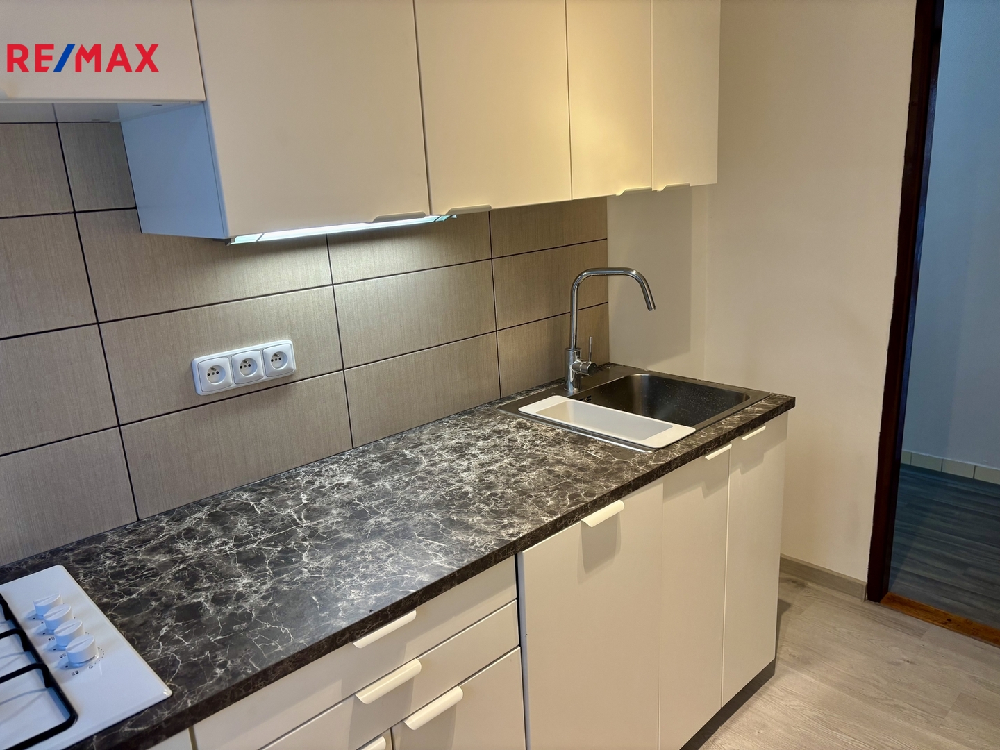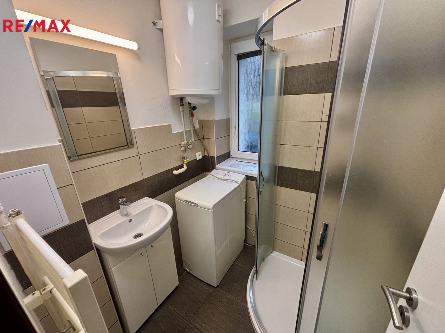 Součástí bytu je funkční kuchyňská linka (bez ledničky) a koupelna vybavená sprchovým koutem a pračkou s vrchním plněním, ohřev vody v bytě zajišťuje elektrický boiler v koupelně. WC je samostatně oddělené od koupelny a podlahová krytina je keramická dlažba. Plastová okna jsou orientována na východ, jih a západ, což zajišťuje slunné prostředí po celý den. Podlahová krytina bytu je plovoucí.