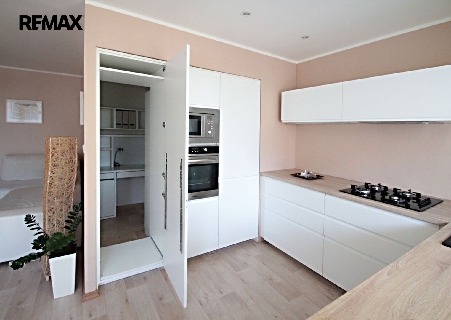 Za kuchyňským koutem je skrytá technická místnost s úložnými prostory a připojením pro pračku.