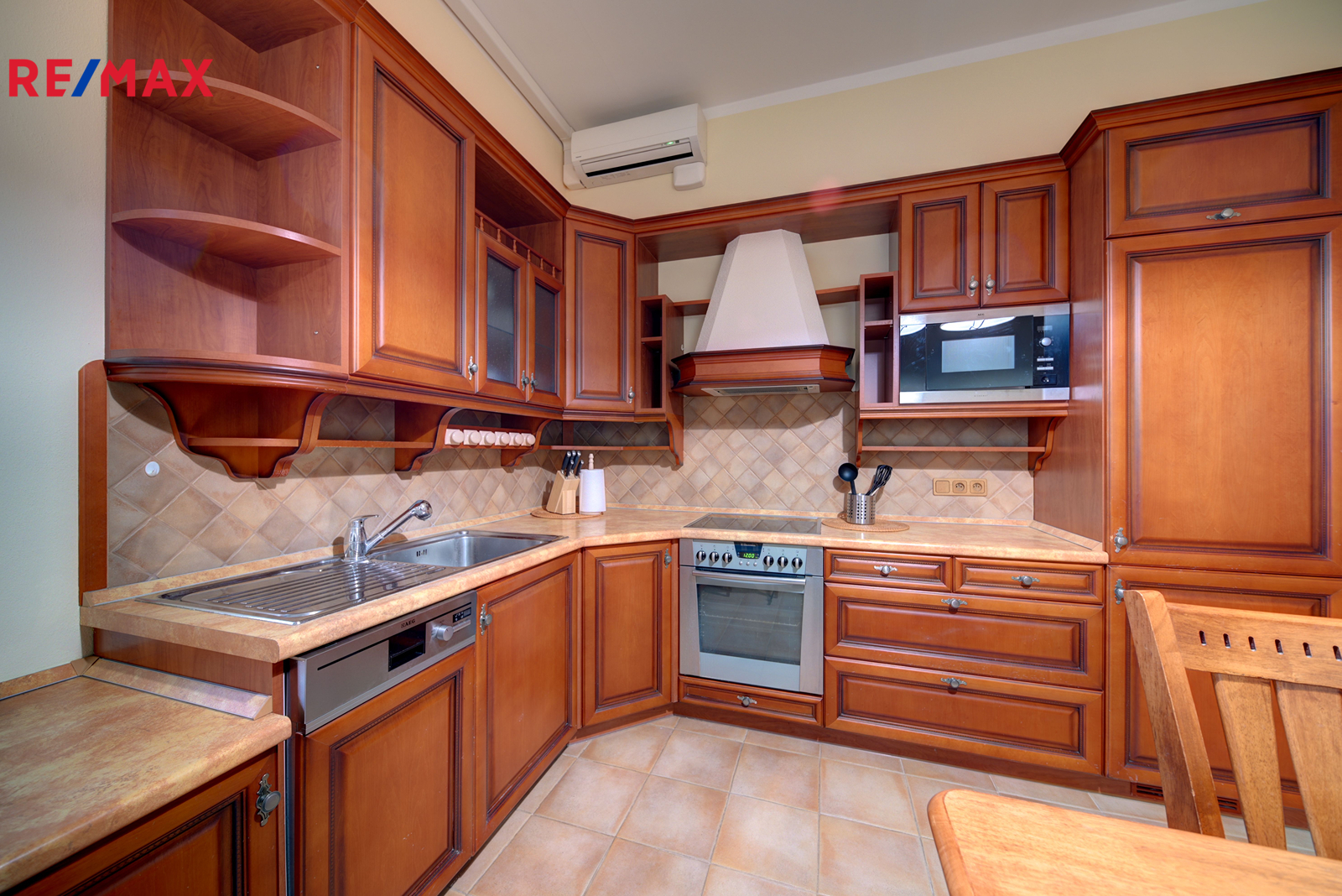 Kuchyň je plně vybavena spotřebiči, jako je myčka, vestavěná trouba a varná deska, nechybí ani nádobí a příbory.