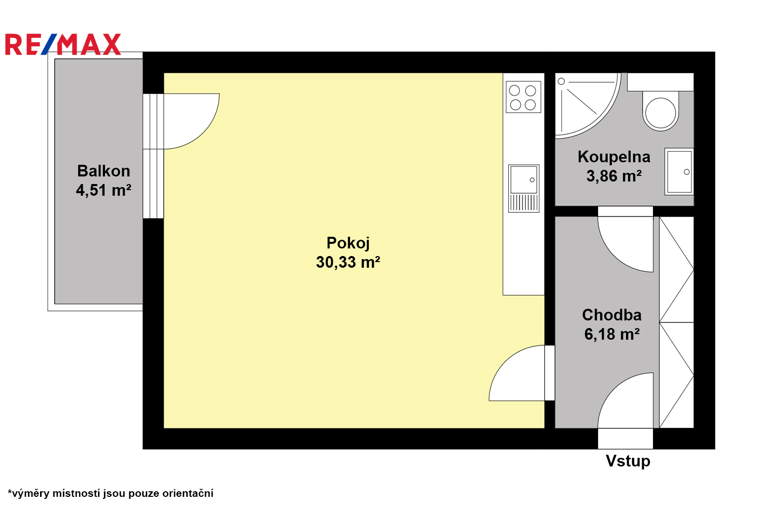 Jedná se o bytovou jednotku 1+kk o užitné rozloze 43 m2 s balkonem (5 m2) v 1. NP ze 4. NP. Dispozičně je členěna na prostornou místnost s vybavenou kuchyňskou linkou (elektrická deska a trouba, digestoř), chodbu s vestavěnými skříněmi a sociální zařízení, kde je umístěn sprchový kout, umyvadlo se závěsnou skříňkou, osvětlené zrcadlo a samostatná toaleta. Na patře je možné využít samostatnou komoru. Po celé ploše bytové jednotky byla položena plovoucí podlaha a dlažba. Součástí oken jsou namontované žaluzie. Termostatem, který je umístěný v místnosti, lze nastavit teplotu v jednotce.