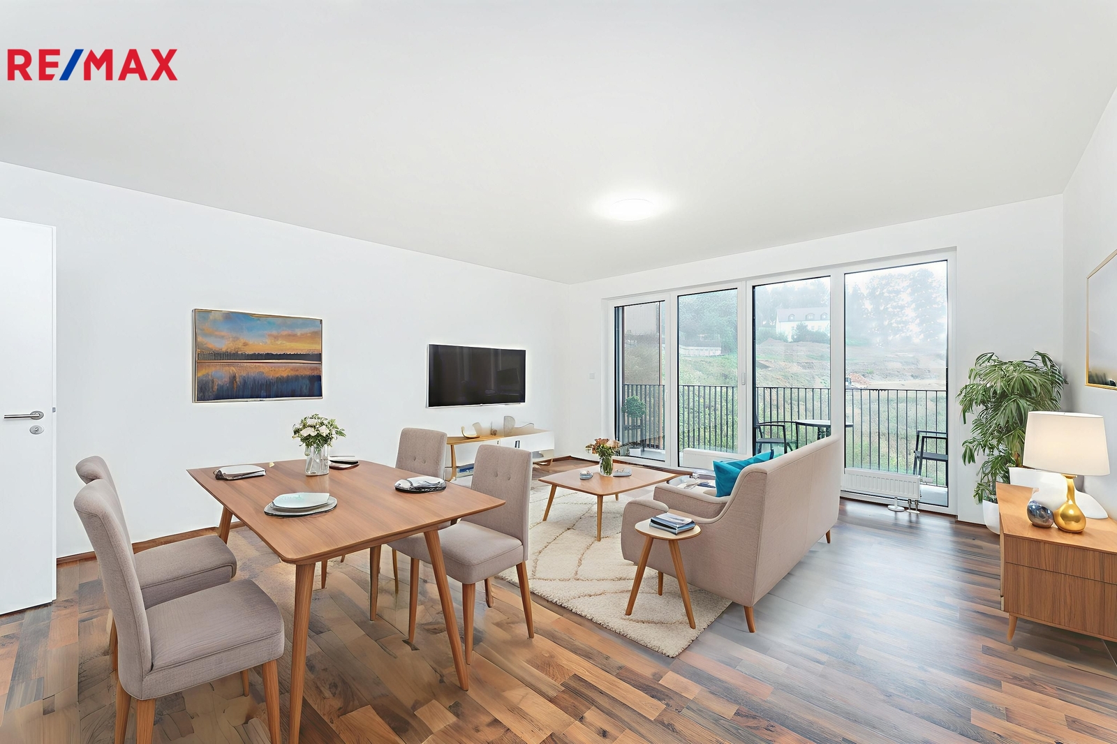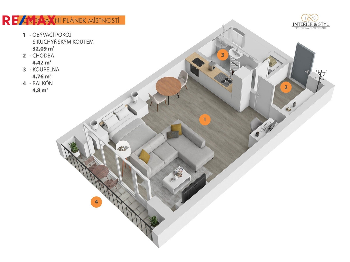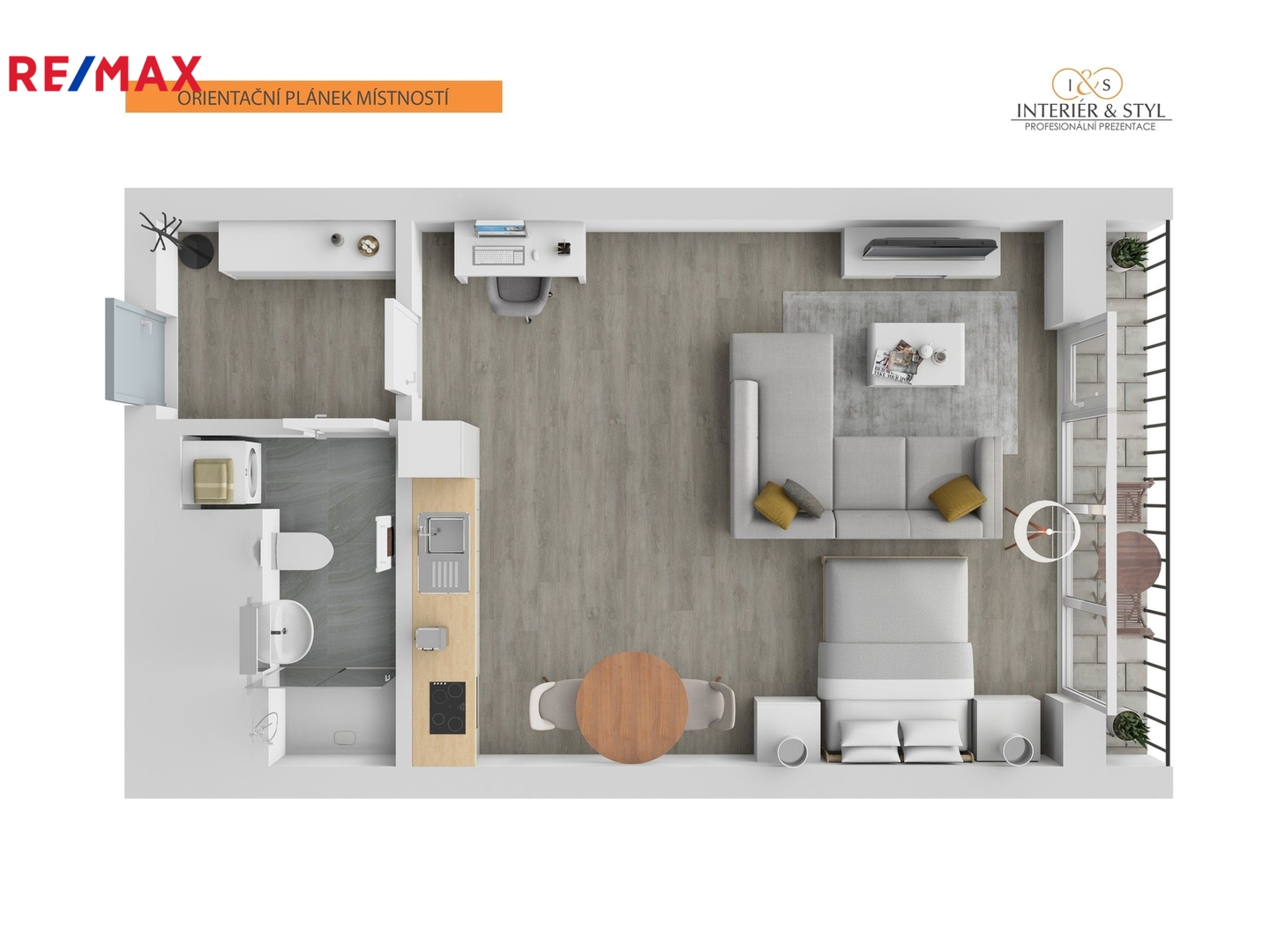 Vzdušný prostor obytné místnosti s kuchyňským koutem má velkorysých 32 m² a díky promyšlené dispozici se sem pohodlně vejde dvoulůžková postel, sedačka, jídelní stůl i pracovní kout. Za velkoformátovými okny s jihozápadní orientací navazuje lodžie (5 m²), ideální pro odpočinek po práci. Venkovní žaluzie na dálkové ovládání zajistí klid, soukromí i příjemné zatemnění. Kuchyňská linka svou kapacitou i vybavením předčí běžné standardy — nabízí dostatek úložného prostoru i kvalitní spotřebiče. V předsíni je vestavěná skříň, v koupelně místo pro pračku a sušičku, sprchový kout, toaleta i umyvadlo. Vybavení na fotografiích není součástí pronájmu, ale je ukázkou možného rozložení prostoru.