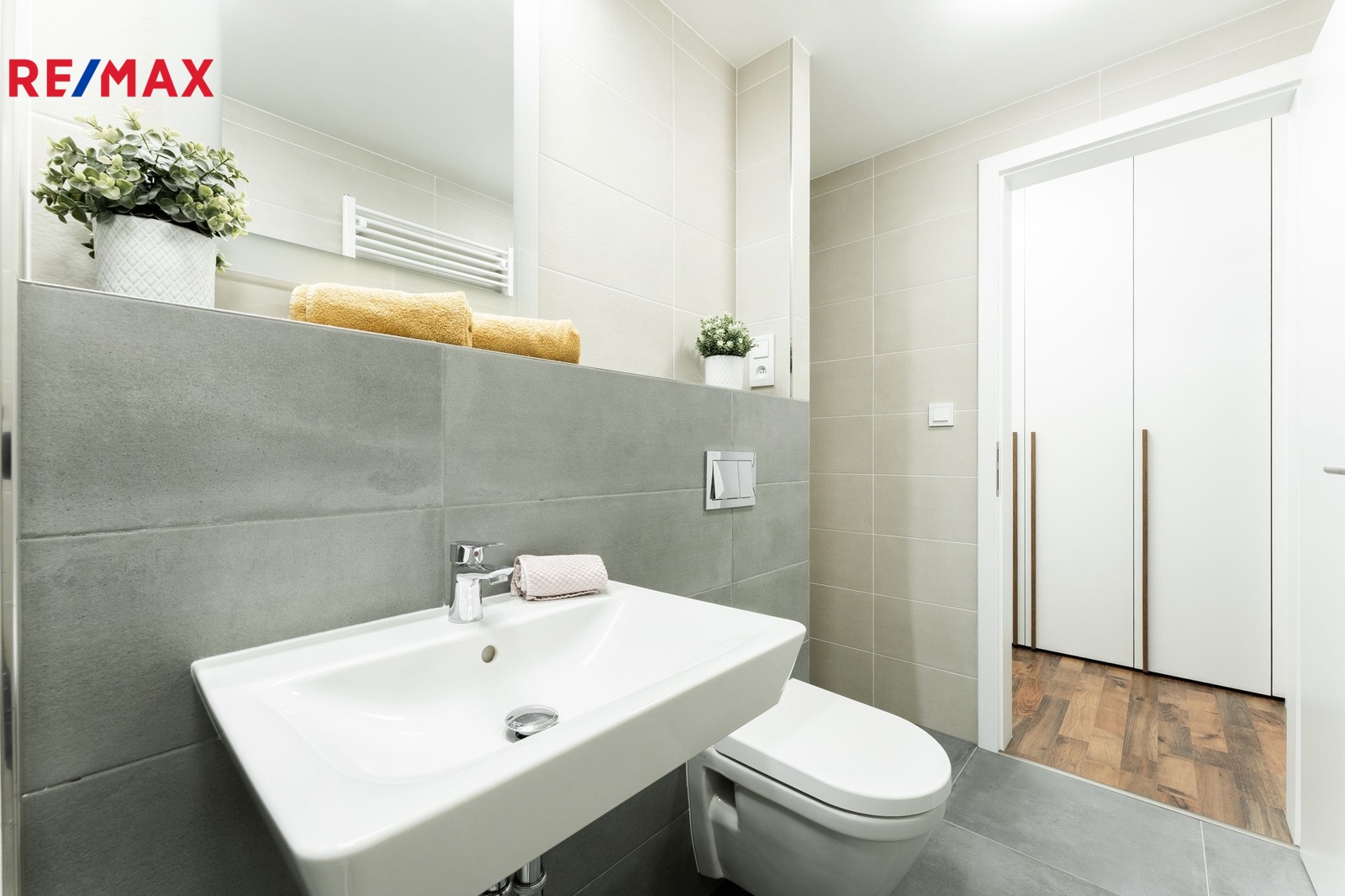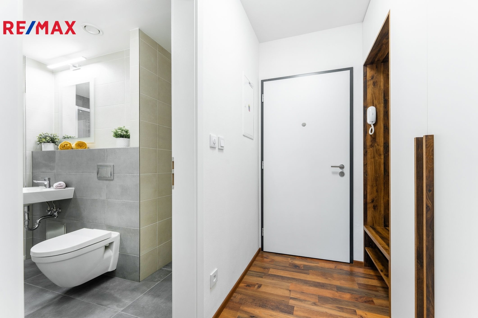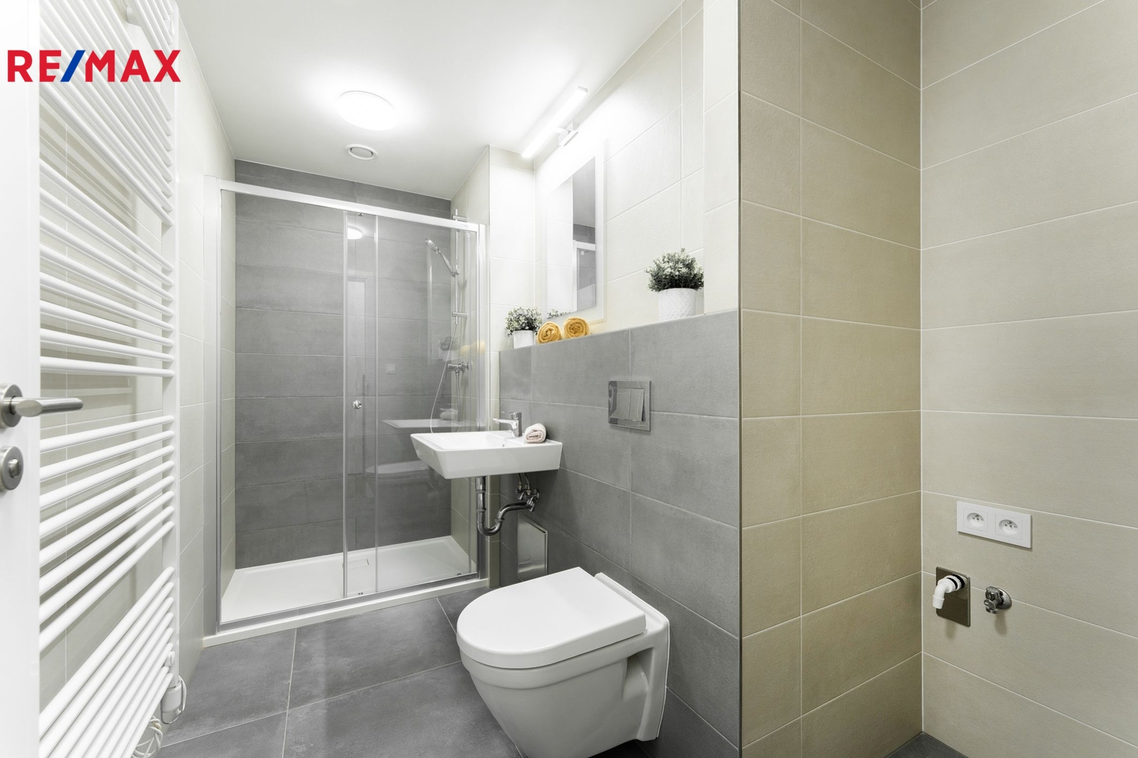 Vzdušný prostor obytné místnosti s kuchyňským koutem má velkorysých 32 m² a díky promyšlené dispozici se sem pohodlně vejde dvoulůžková postel, sedačka, jídelní stůl i pracovní kout. Za velkoformátovými okny s jihozápadní orientací navazuje lodžie (5 m²), ideální pro odpočinek po práci. Venkovní žaluzie na dálkové ovládání zajistí klid, soukromí i příjemné zatemnění. Kuchyňská linka svou kapacitou i vybavením předčí běžné standardy — nabízí dostatek úložného prostoru i kvalitní spotřebiče. V předsíni je vestavěná skříň, v koupelně místo pro pračku a sušičku, sprchový kout, toaleta i umyvadlo. Vybavení na fotografiích není součástí pronájmu, ale je ukázkou možného rozložení prostoru.