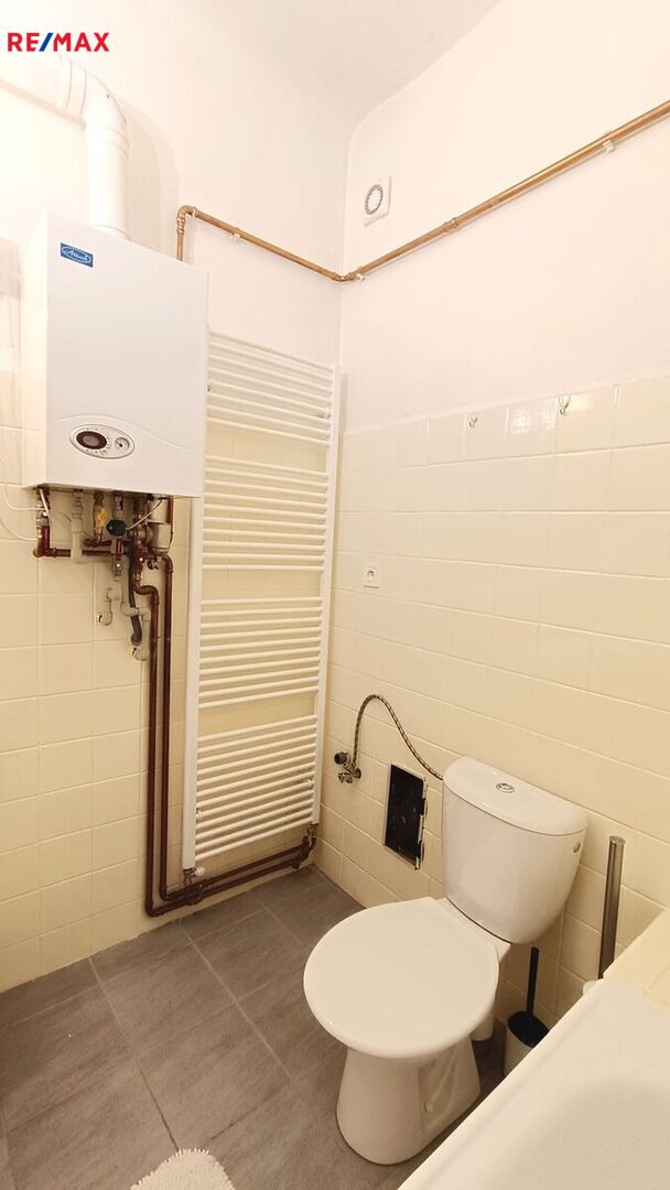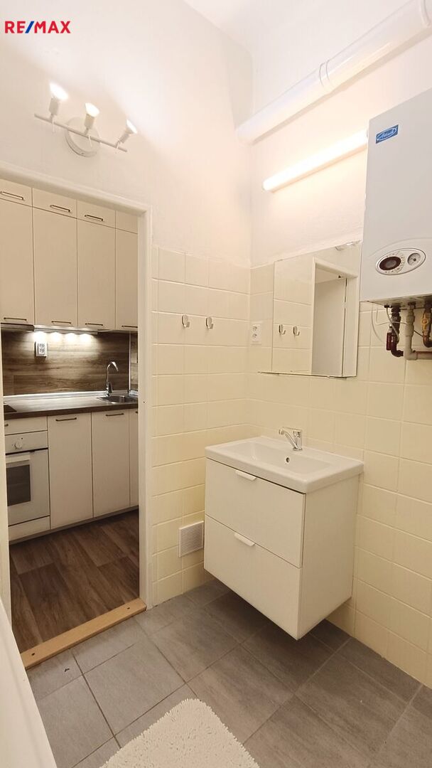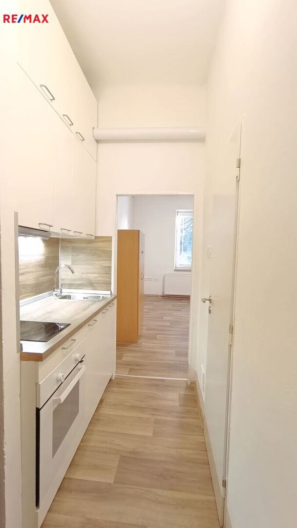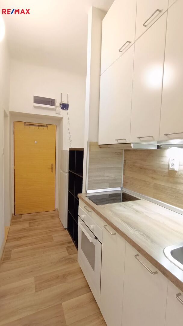 Byt se sestává z obývacího pokoje, malé kuchyňky, koupelny s WC a spíže. Byt je z roku 2022 po rekonstrukci, s novou kuchyňskou linkou, novými spotřebiči, nové podlahové krytiny a vnitřní dveře, nová elektroinstalace a rozvody vody a odpadu. Byt je vytápěn radiátory, napojenými na plynový kondenzační kotel s průtokovým ohřívačem vody.