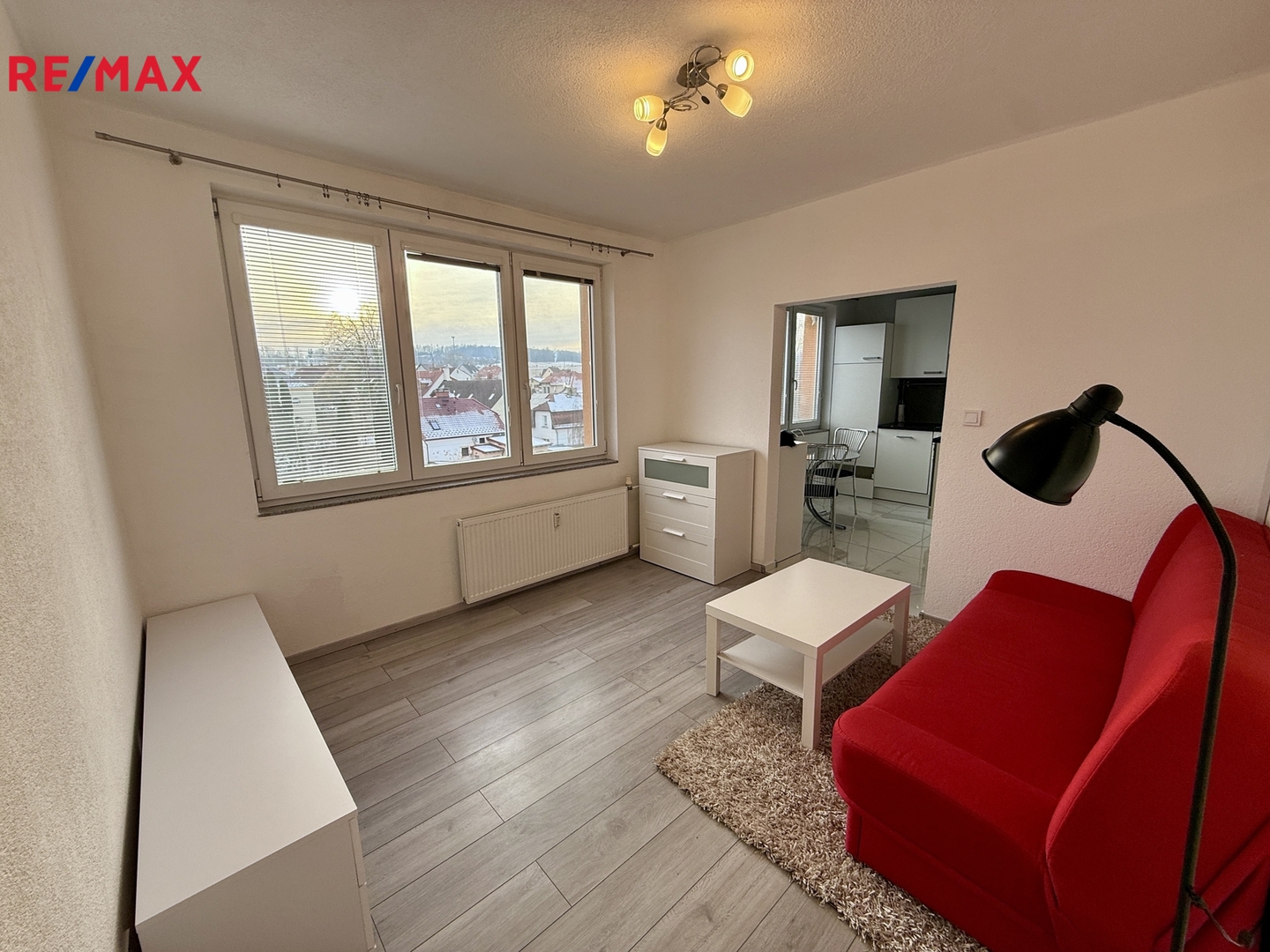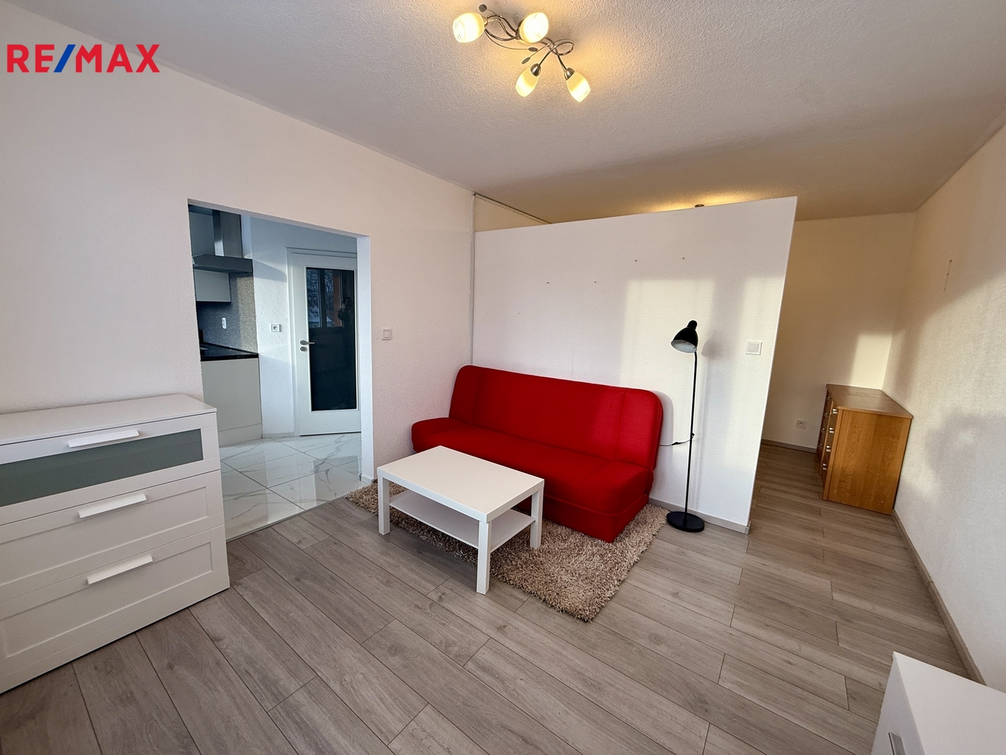 Byt je po rekonstrukci a pronajímá se kompletně vybavený. Nabízí prakticky řešený obytný prostor s obývací částí, ze které je oddělený spací kout s manželskou postelí. Kuchyně je samostatná, vybavená moderní kuchyňskou linkou, spotřebiči včetně myčky a jídelním koutem. Koupelna je spojena s toaletou a je zde sprchový kout i pračka. Dostatek úložného prostoru zajišťují vestavěné skříně v chodbě.