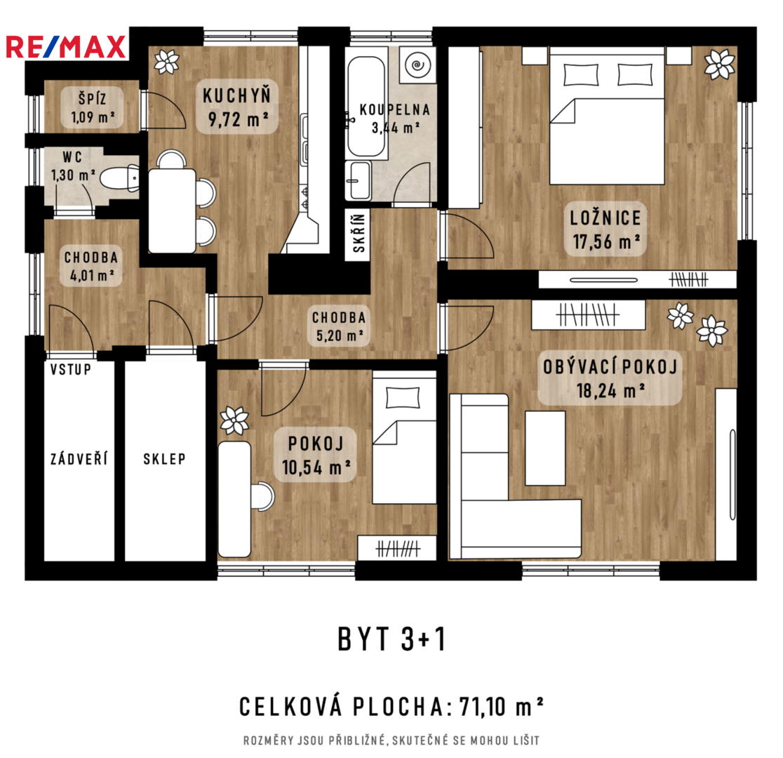 Dispozice 3+1 poskytuje dostatek prostoru pro každodenní život – prostorný obývací pokoj, kuchyně s jídelnou a spíží, samostatná toaleta, koupelna, ložnice i dětský pokoj (šatna nebo pracovna - jak kdo potřebuje) zaručují soukromí a klid. K bytu dále náleží garáž, z části je možné využít i sklep a největší výhodou je možnost využívání společné zahrady, kde je vyčleněná část přímo pro nájemníky.
