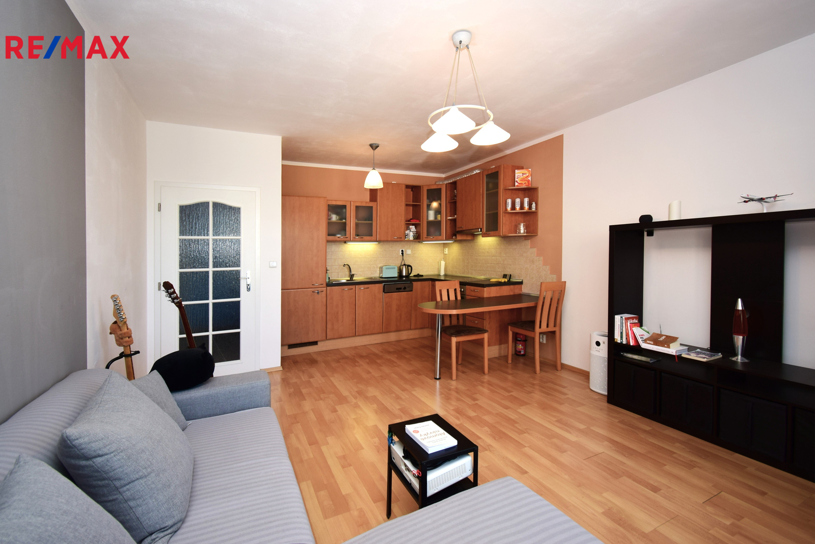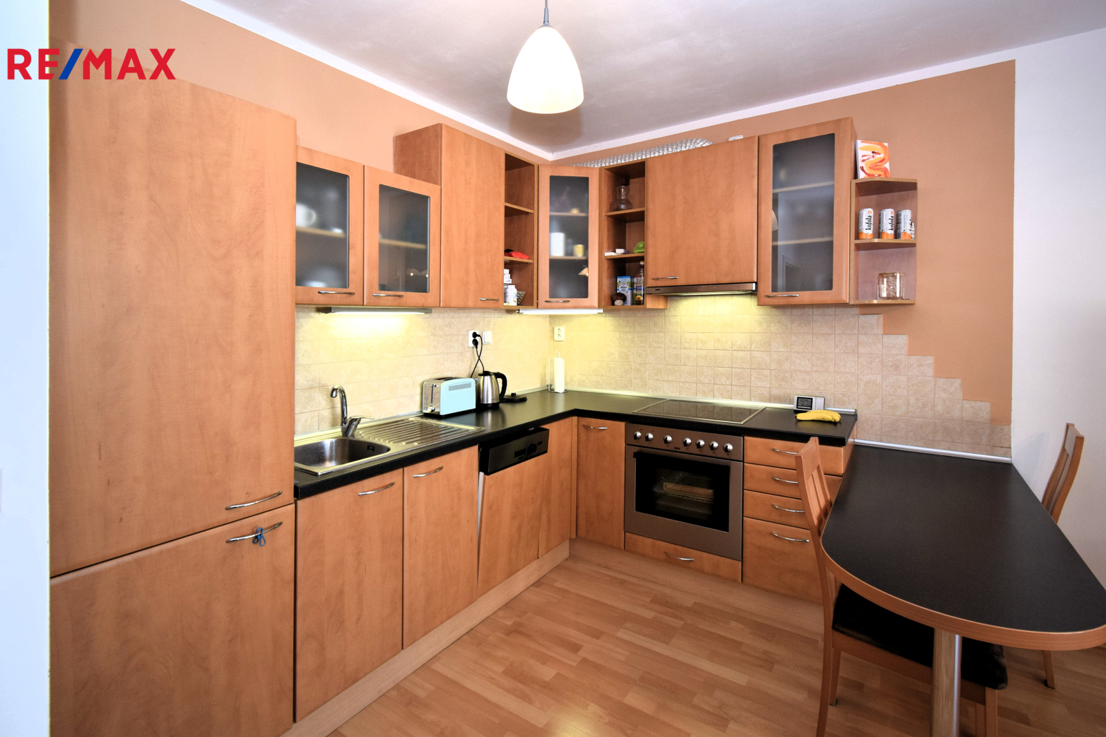 Prostorný obývací pokoj s plně vybavenou kuchyňskou linkou (lednice s mrazákem, myčka, trouba, varná deska, digestoř)