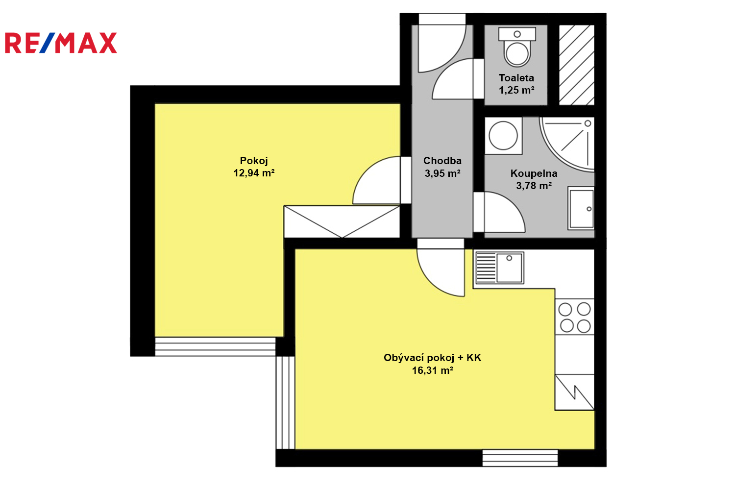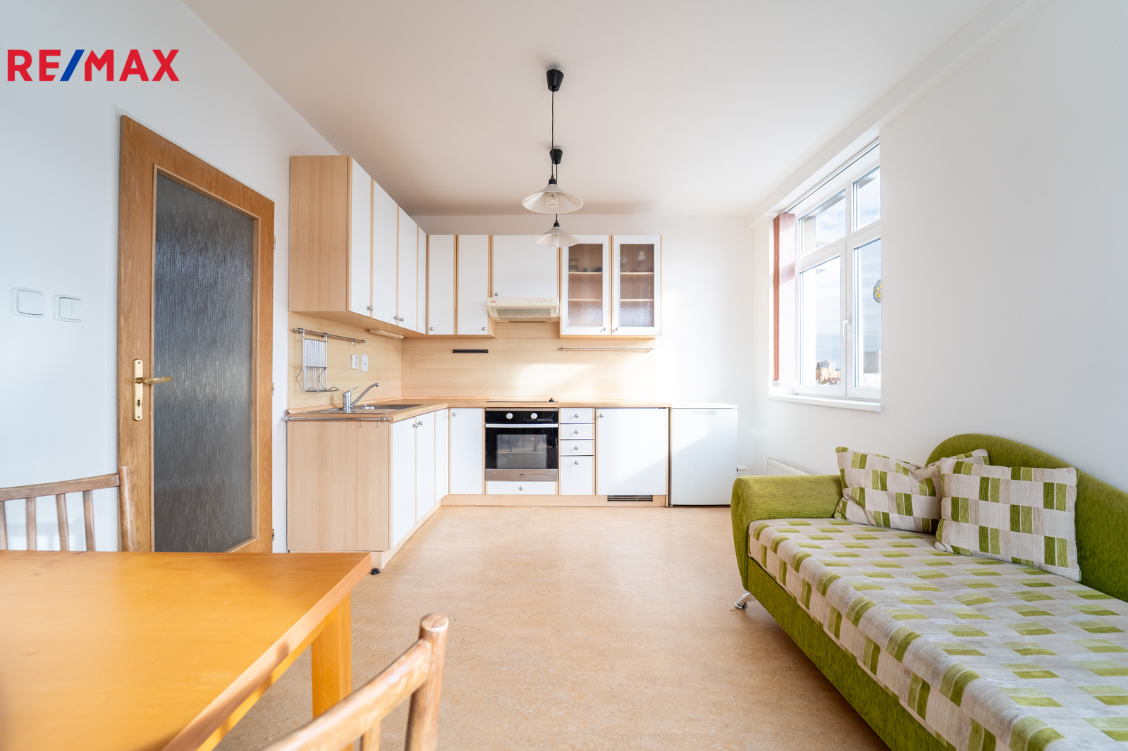 Byt tvoří obývací pokoj s kuchyňským koutem, samostatná ložnice s pracovnou, chodbička, koupelna se sprchovým koutem, pračkou a oddělené WC.