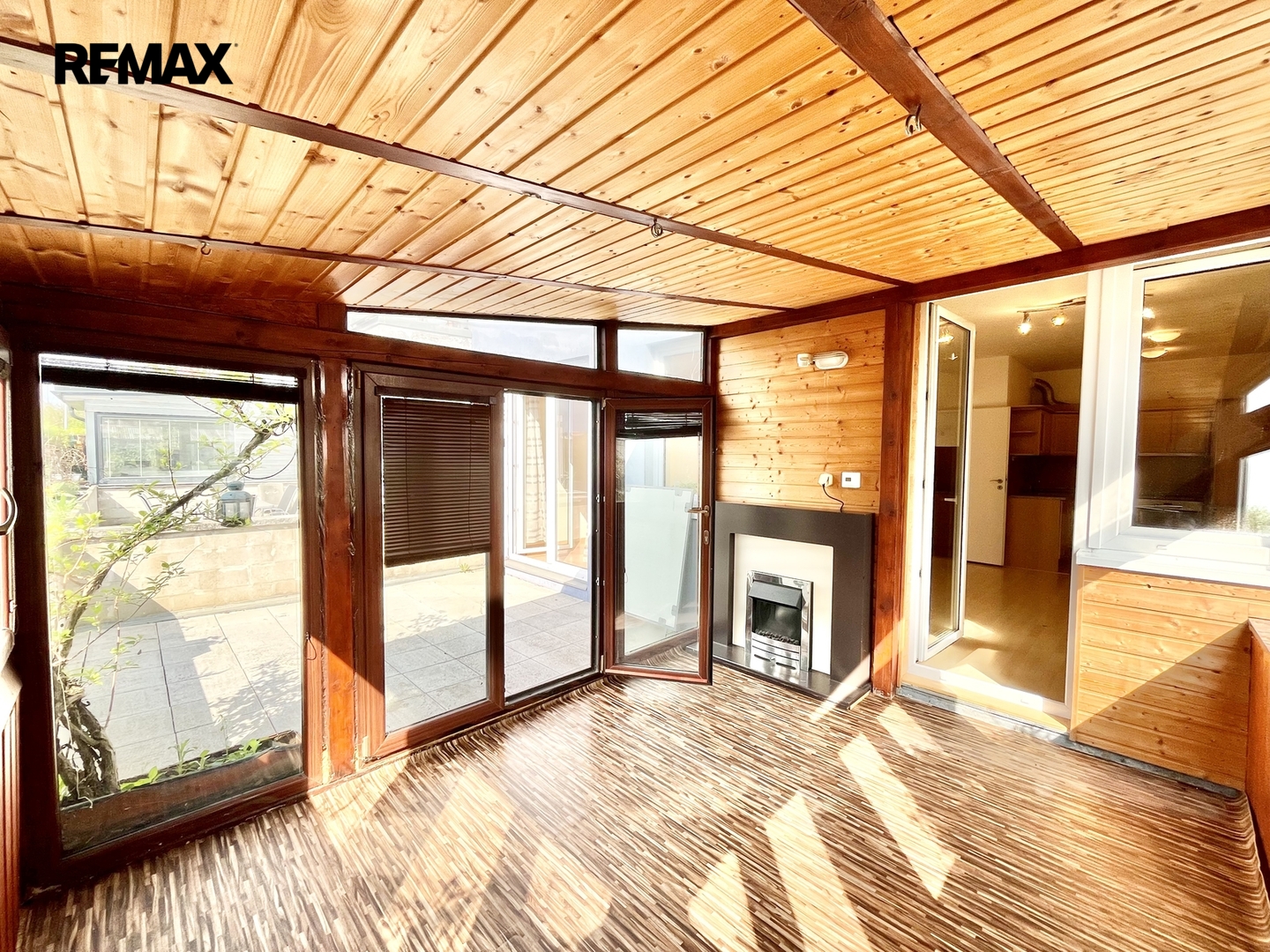 Prostornou terasu využijete v teplých dnech a zimní zahradu oceníte i v chladných měsících při posezení u elektrických krbových kamen.