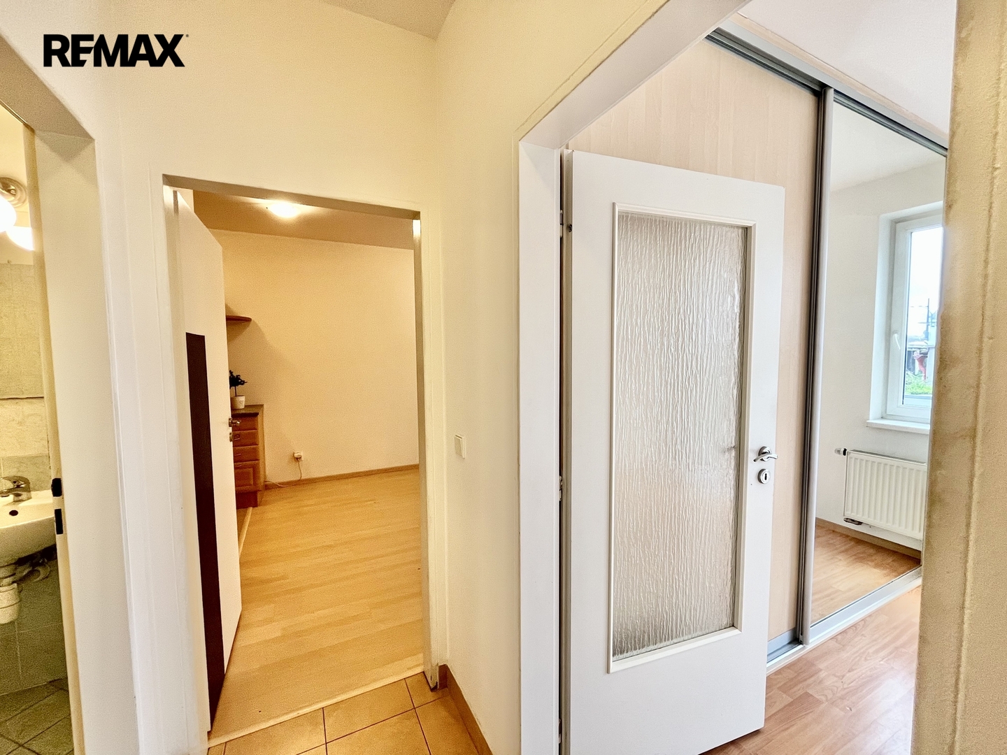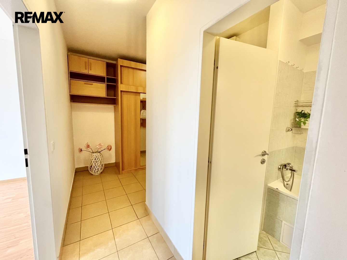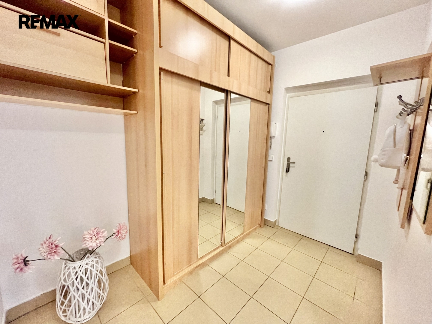 V bytě je kuchyňská linka vybavená spotřebiči a pračkou. Vestavěné skříně v předsíni a ložnici nabízí velkorysý úložný prostor.
