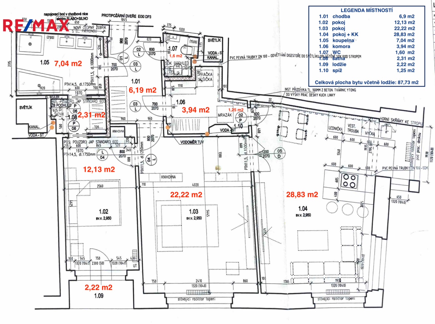 Dispozice bytu nabízí mnoho možností a sestává z obývacího pokoje s kuchyňským koutem (28,8 m2), 2 pokojů (12 m2 s lodžií a 22,2 m2), prostorné koupelny s vanou, sprchovým koutem a dvojumyvadlem (7 m2), samostatného WC s bidetem (1,6 m2), komory (3,9 m2) a šatny (2,3 m2).
