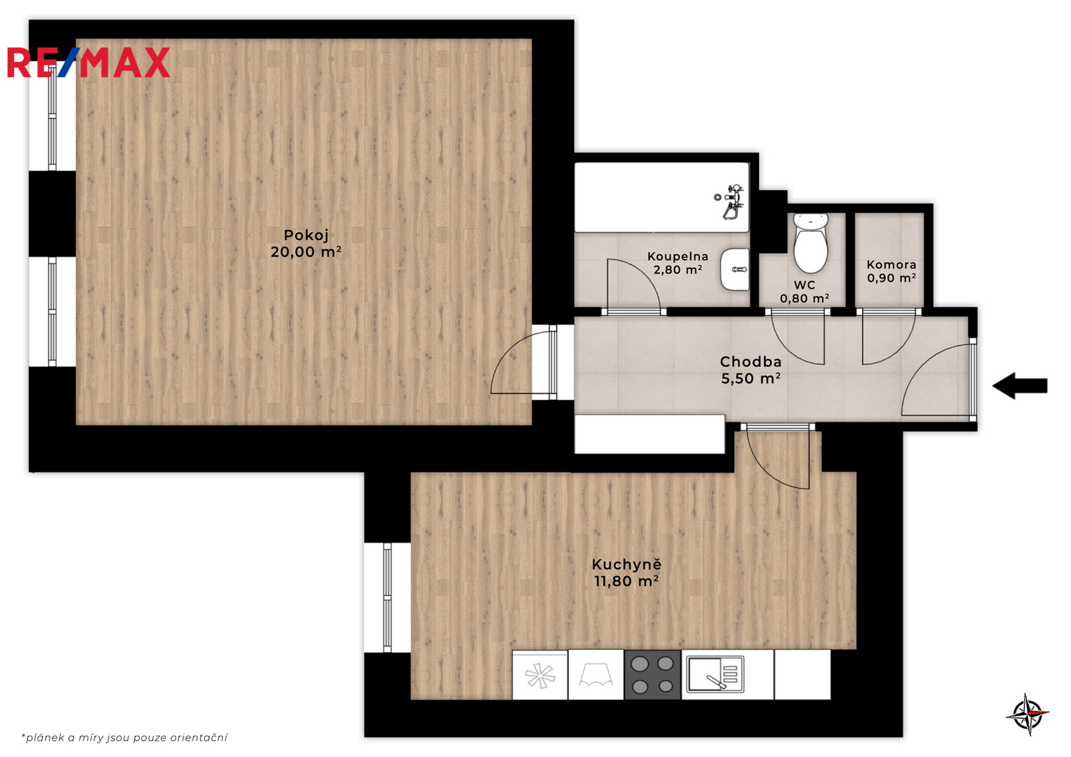 Byt se pronajímá nezařízený. Součástí bytu je kuchyňská linka vybavená plynovým sporákem a elektrickou troubou. V předsíni se nachází prostorná vestavěná skříň, která poskytuje dostatek úložného prostoru. Dispozici bytu tvoří kuchyně, pokoj, předsíň, koupelna, samostatná toaleta a komora.