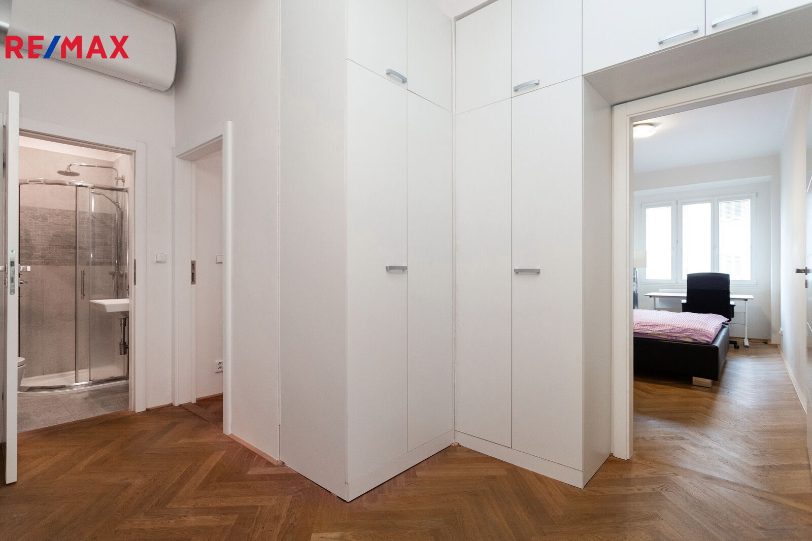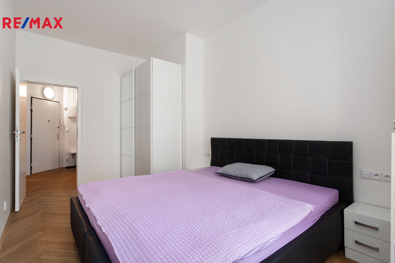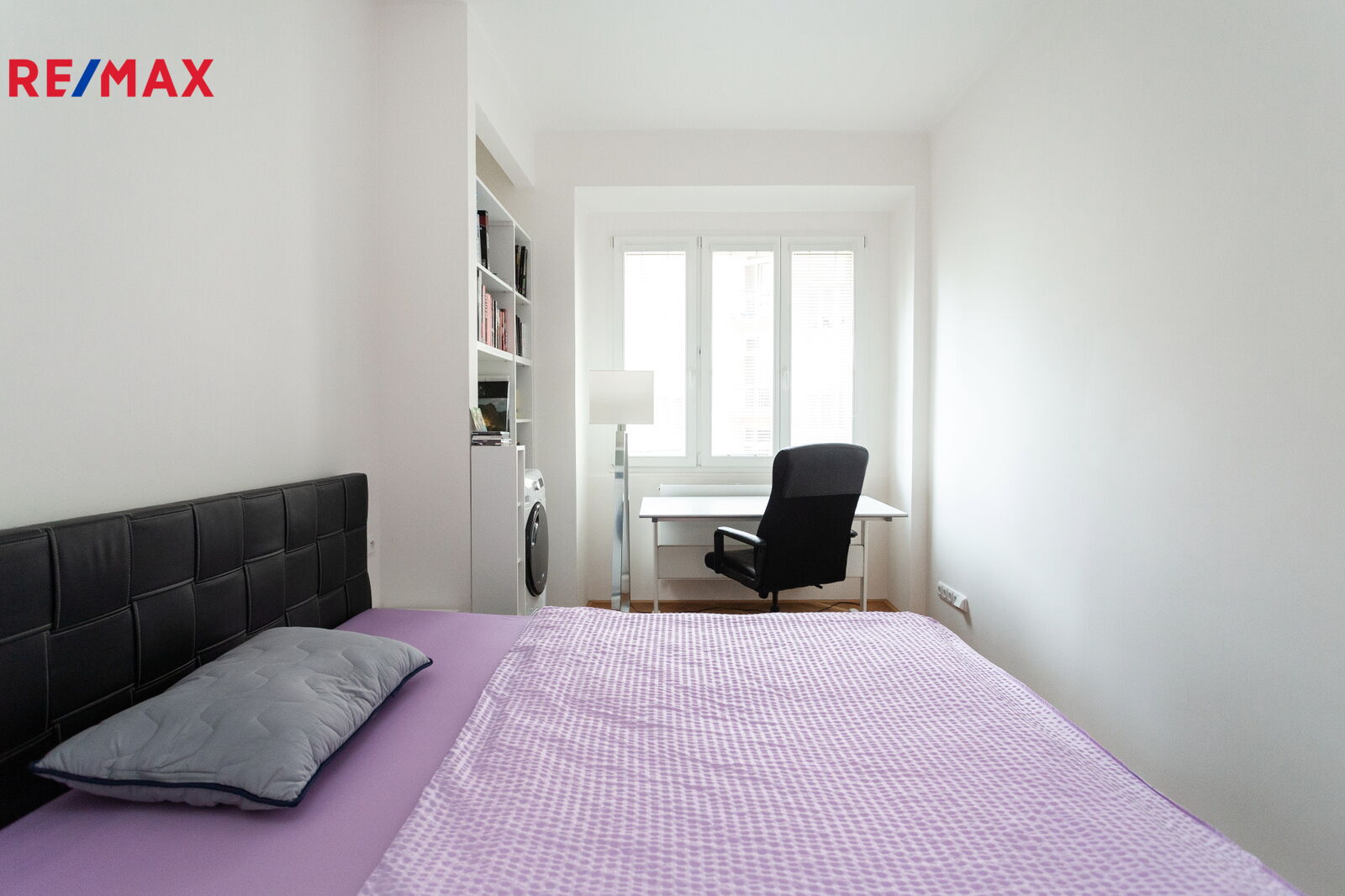 Kuchyně s moderní kuchyňskou linkou, lednicí a barovým sezením. Obývací část a ložnice s okny do klidného vnitrobloku. Koupelna se sprchovým koutem a toaletou, prostorná předsíň. Dřevěné parkety, dlažba. Sklep. Pračka, sušička.