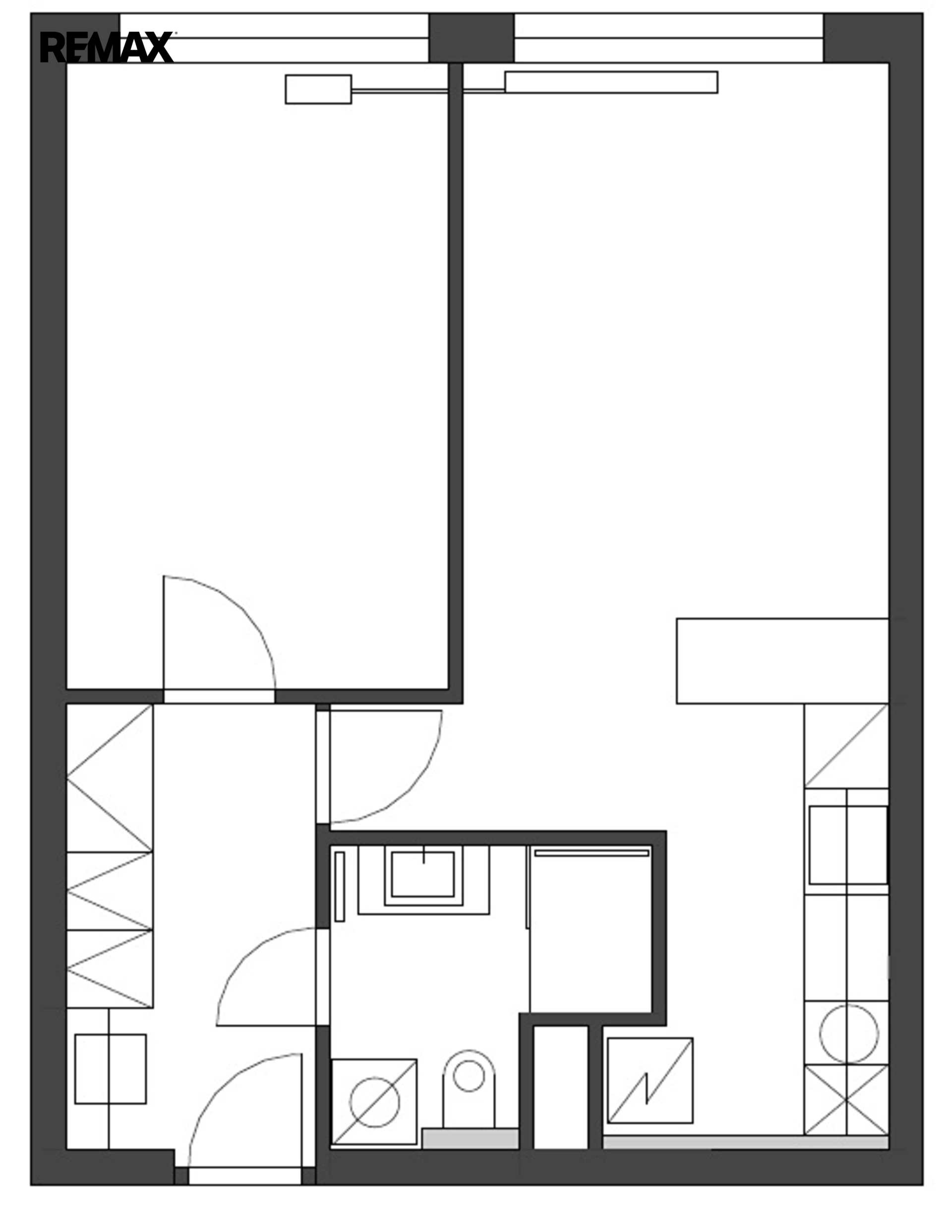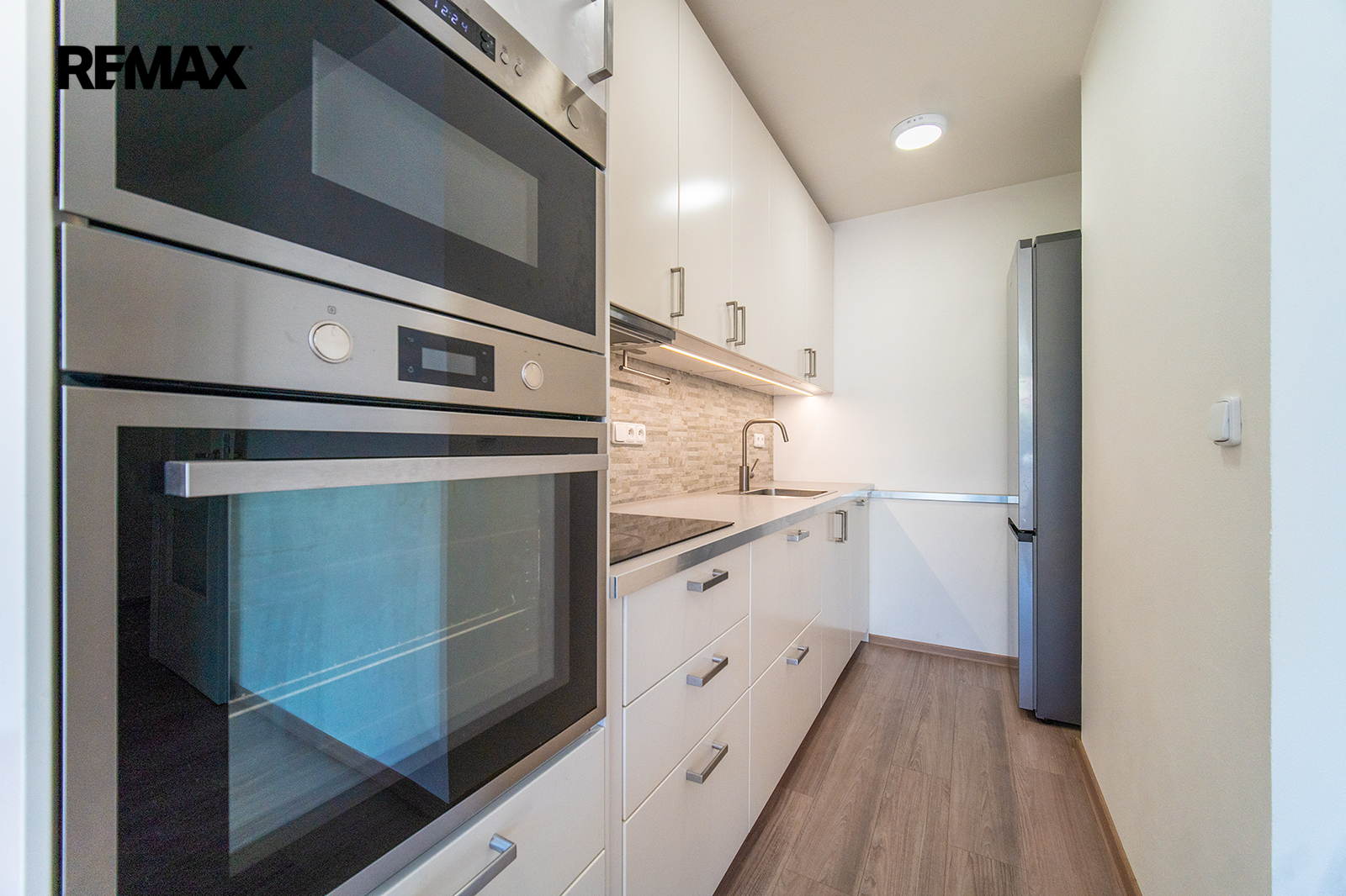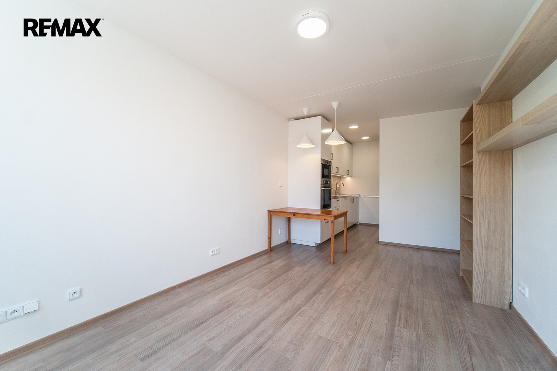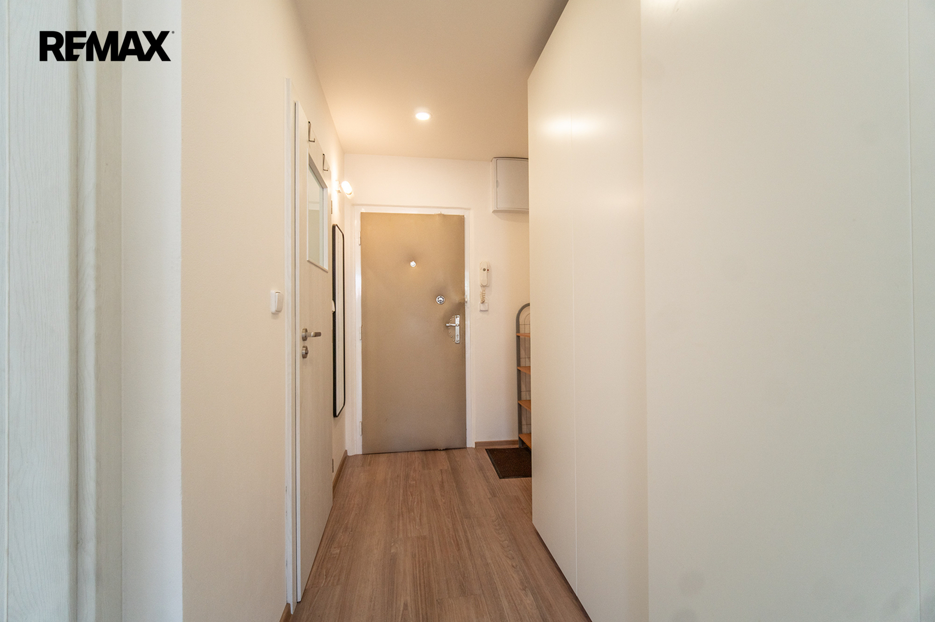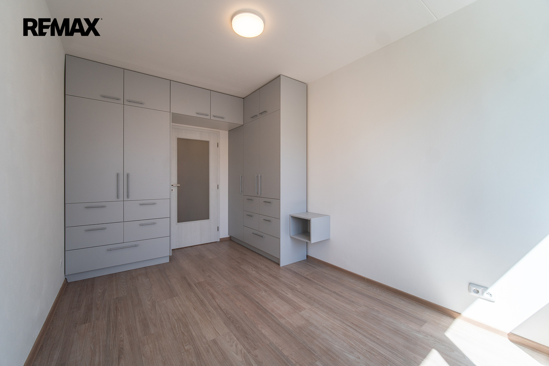 Samotná jednotka má dispozici 2+kk. Co je pro nájemníky připraveno na místě je zřejmé z fotografií. Můžete se těšit na plně vybavený kuchyňský kout u obývacího pokoje, no a v ložnici na hromadu úložného prostoru ve vestavěných skříních na míru. Ty samozřejmě najdete i v předsíni.