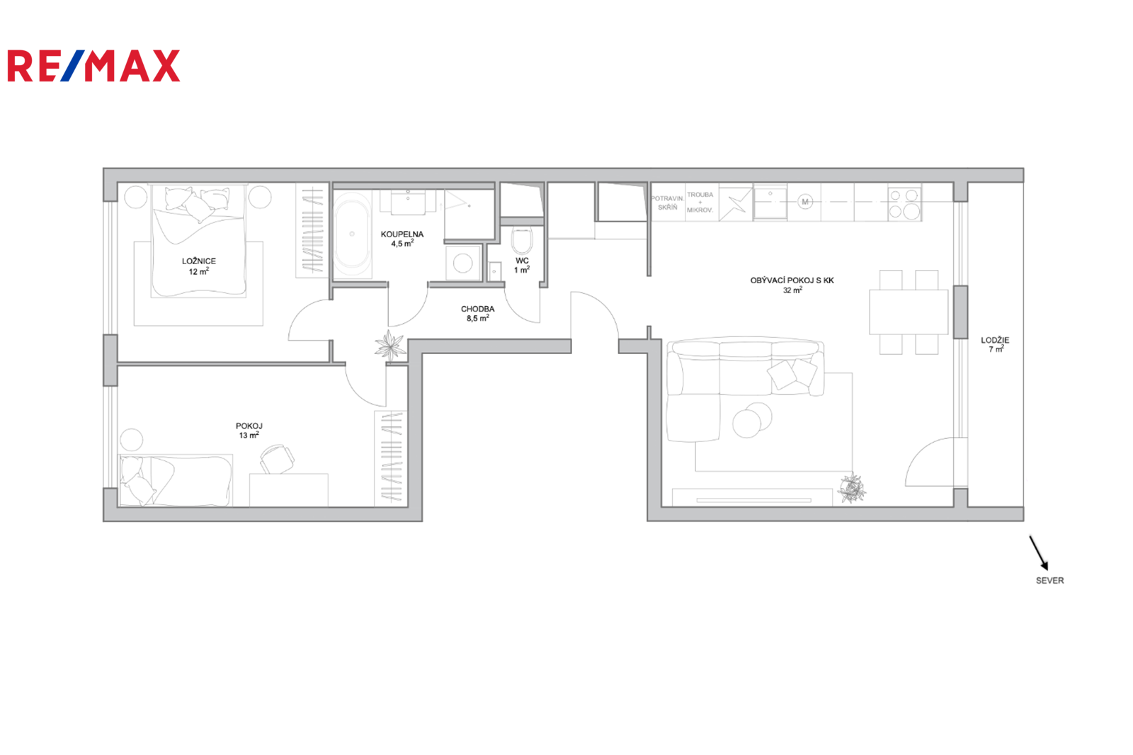 - Obývací pokoj s kuchyňským koutem: 32 m²