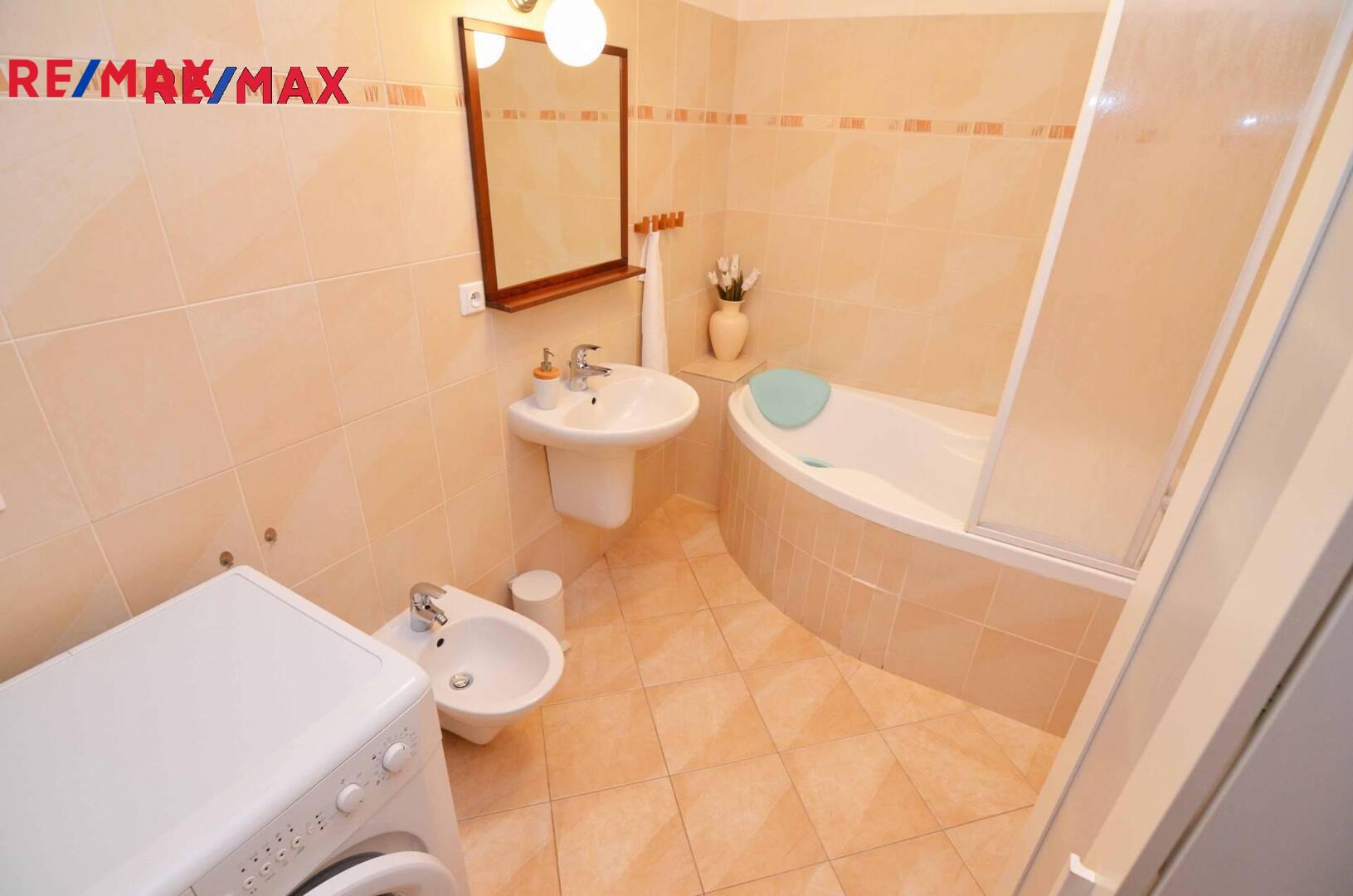 Koupelna s vanou, pračkou, umyvadlem a toaletní skříňkou.