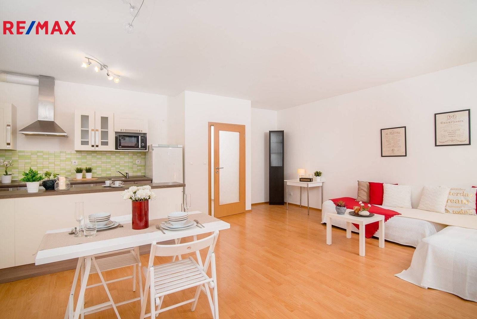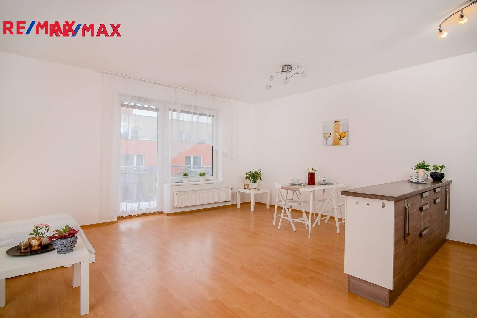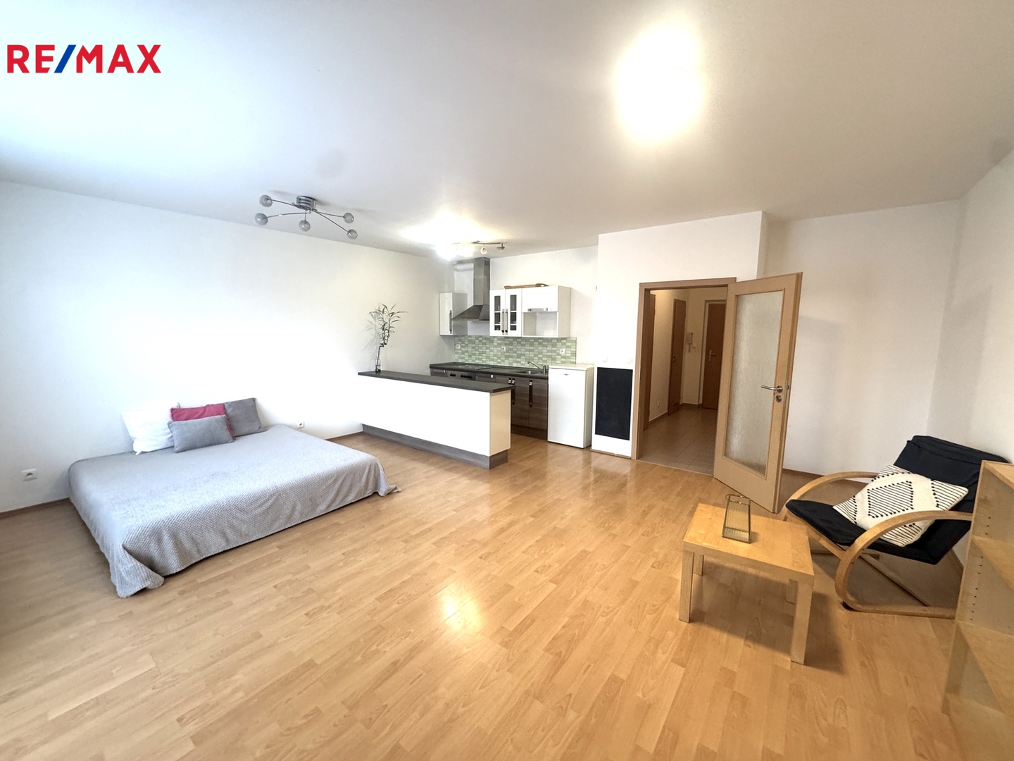 Hlavní obytný prostor nabízí otevřenou dispozici a vstup na prostorný balkon ( 6 m2) . Kompletně vybavená kuchyňská linka, na podlaze plovoucí podlaha a dlažba. Byt není zařízen nábytkem z fotografií, je zde manželská postel, po dohodě s majitelem možno částečně dovybavit. Byt je díky svému umístění v domě velmi klidný.