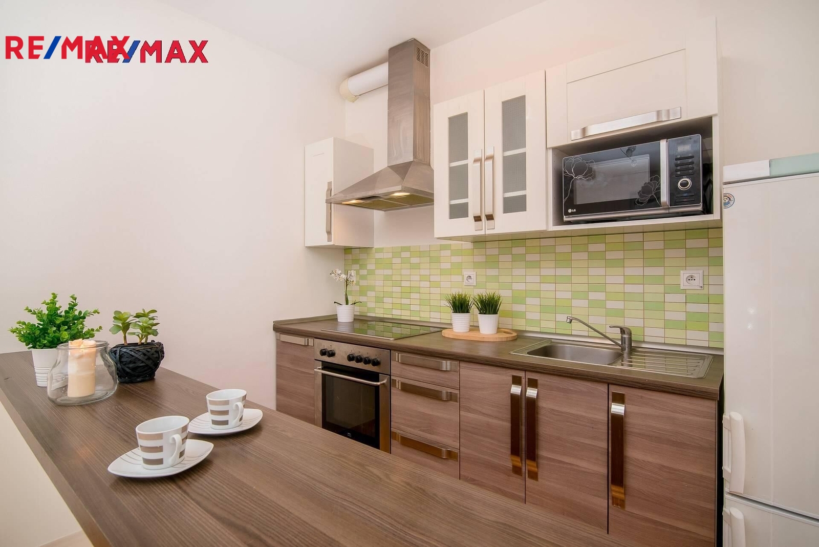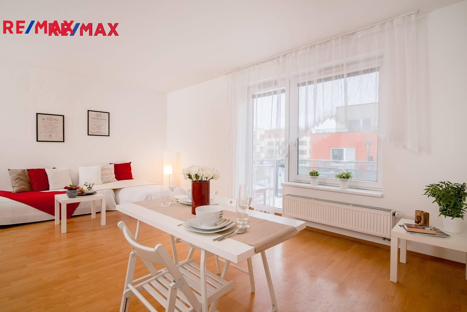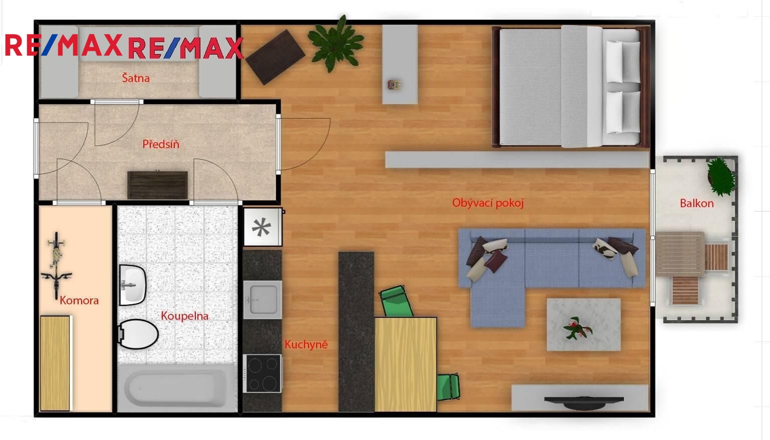 Hlavní obytný prostor nabízí otevřenou dispozici a vstup na prostorný balkon ( 6 m2) . Kompletně vybavená kuchyňská linka, na podlaze plovoucí podlaha a dlažba. Byt není zařízen nábytkem z fotografií, je zde manželská postel, po dohodě s majitelem možno částečně dovybavit. Byt je díky svému umístění v domě velmi klidný.
