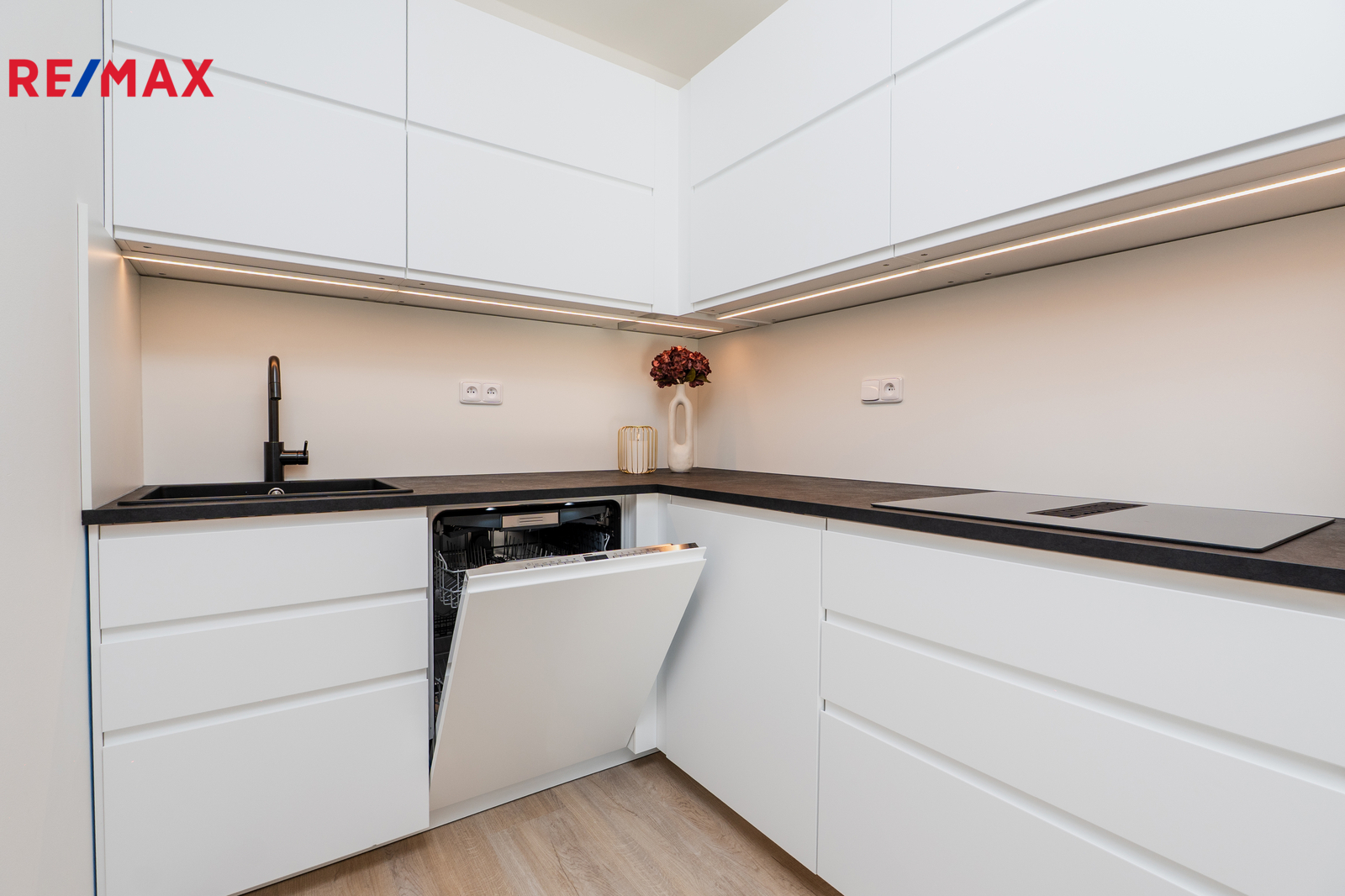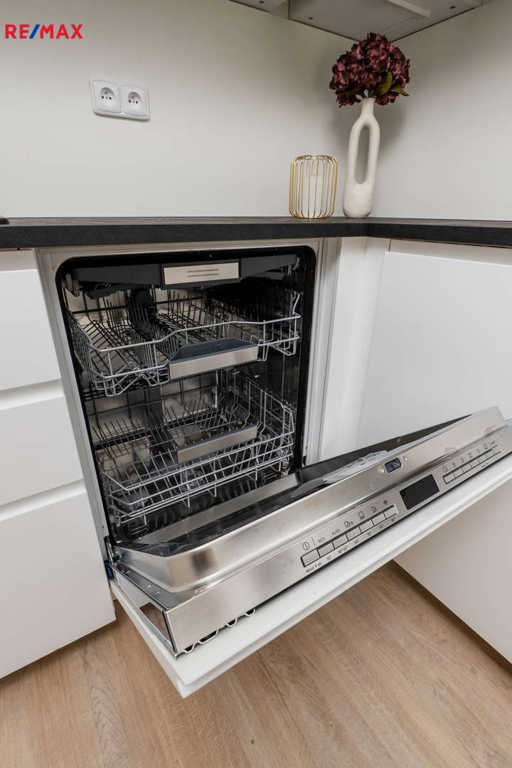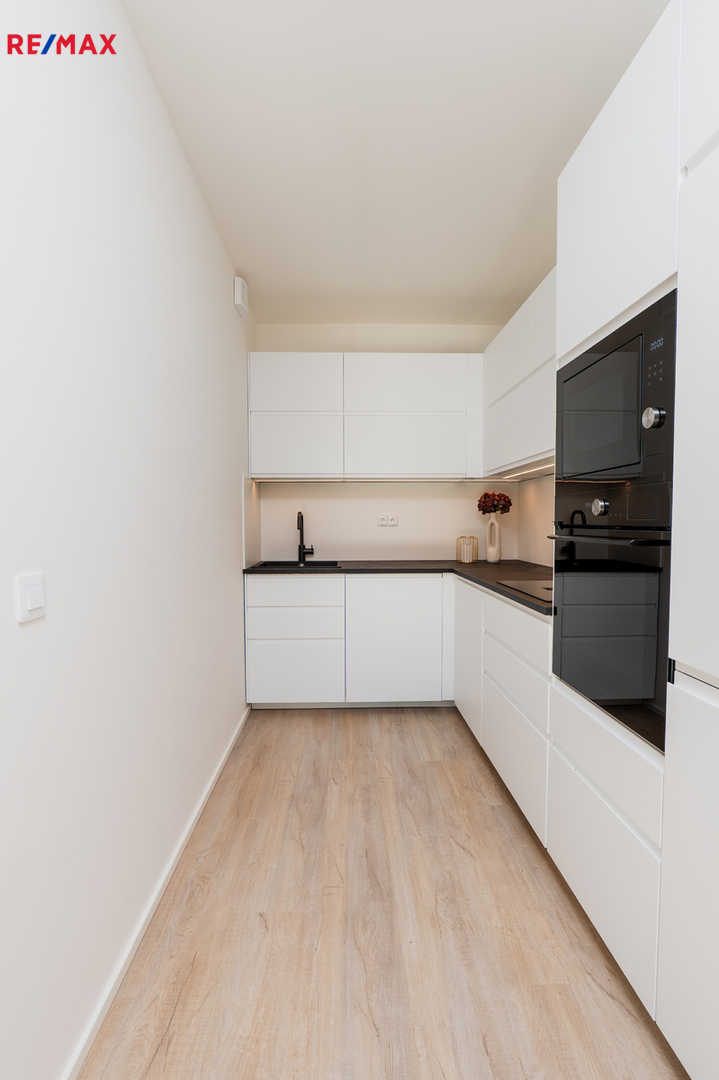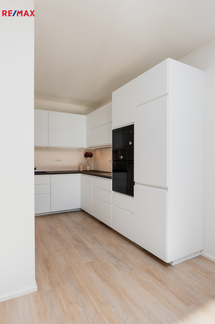 Součástí vybavení je nová kuchyňská linka na míru, plně vybavená všemi spotřebiči (myčka, trouba, varná deska, digestoř, lednice s mrazákem). V bytě jsou dále dvě velké vestavěné skříně s dostatkem úložného prostoru. Osvětlení se aktuálně dokončuje.