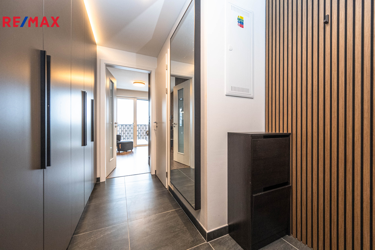 V obývacím pokoji a v ložnici jsou laminátové podlahy. V hale a dále v koupelně s toaletou je dlažba. V bytě jsou moderní osvětlovací tělesa. Okna jsou plastová, mají více komorový plastový rám s trojsklem a jsou opatřená venkovními roletami - AL lamelová žaluzie v systémovém skrytém podomítkovém boxu, el. ovládaná. Vchodové dveře bezpečnostní, protipožární, akustické, falcové.