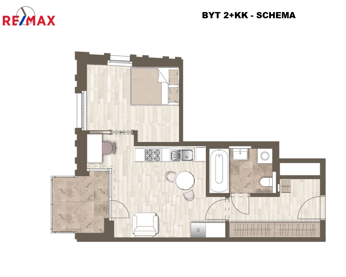 Dispozice bytu: obývací pokoj s kuchyňským koutem, ložnice, vstupní hala, koupelna s vanou a toaletou.