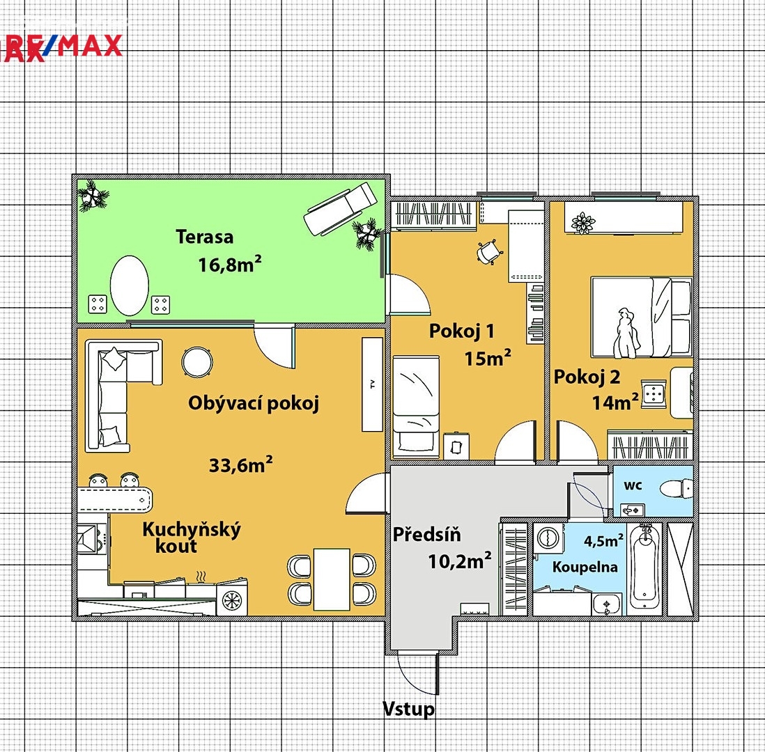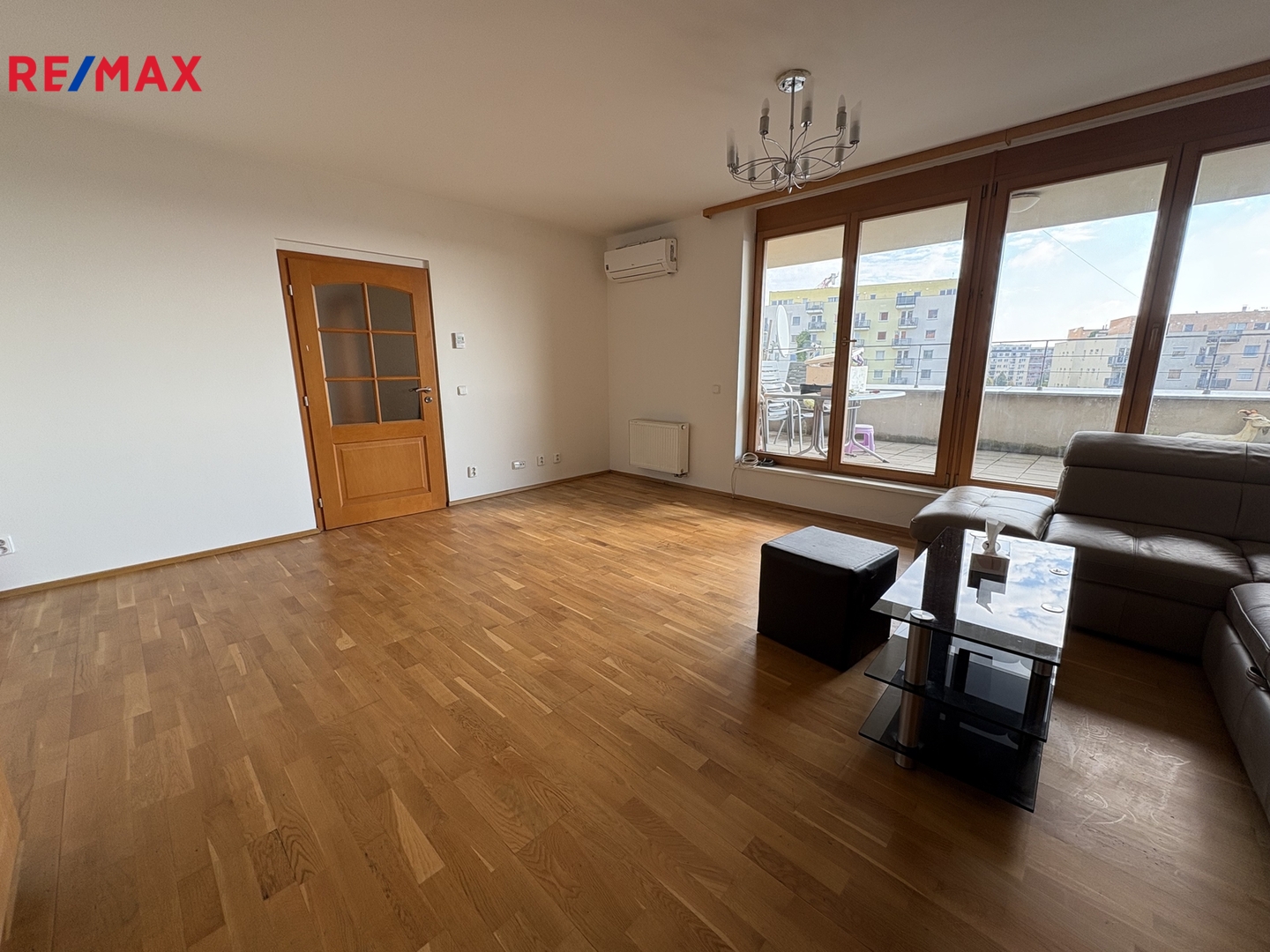 Popis bytu: vstupní hala s vestavnou skříní (10,64m2), obývací pokoj s kuchyňským koutem (32,12m2) a se vstupem na prostornou terasu (17 m2), 2 ložnice (15,06 m2 a 13,93 m2 s vstupem terasu), koupelna s vanou a pračkou, samostatná toaleta. V bytě jsou dřevěné eurookna a satelitní anténa. Byt je kompletně vybavený nábytkem, digitální termostatem a klimatizací.